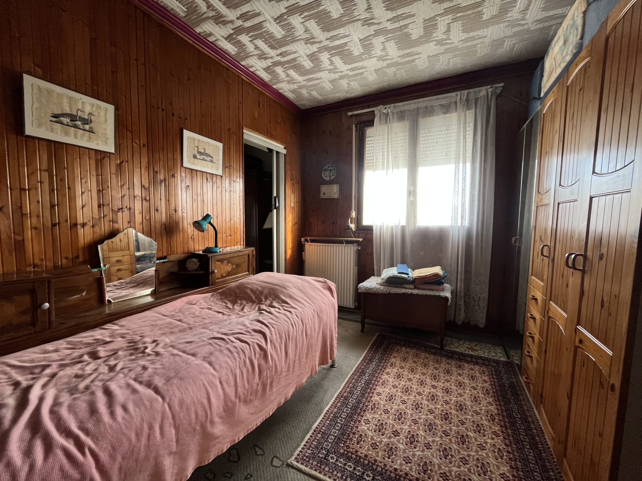 à l'étage on arrive dans une chambre qui a d'un côté un bureau ou une petite chambre et de l'autre une salle de bains.