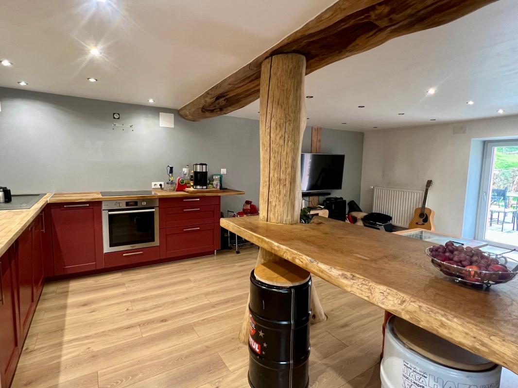 o Un rez-de-chaussée entièrement rénové, avec une entrée, une cuisine avec coin repas et un séjour donnant sur une terrasse. En annexe, une ancienne grange servant d'espace chaufferie-atelier-buanderie.