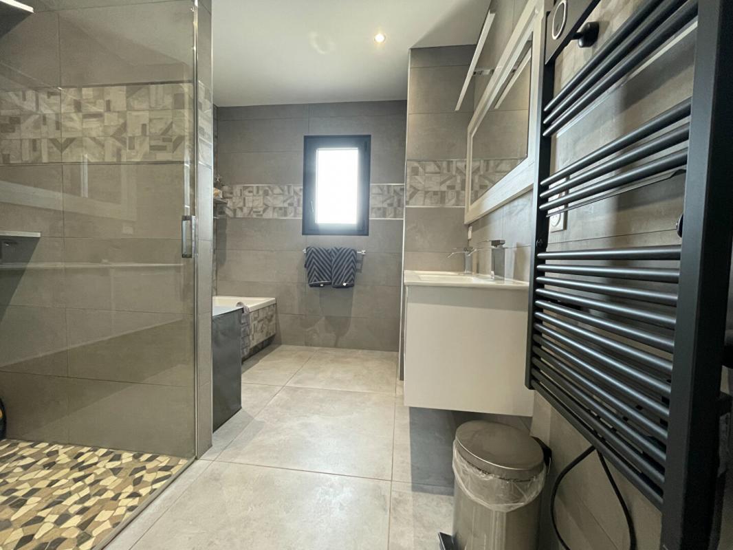 Magnifique maison de surface habitable de 132 m2 avec garage de 18 m2. Dés que vous franchirez le seuil , vous serez séduit par l'atmosphère chaleureuse qui règne dans chaque pièce. Une belle entrée vous accueille suivie d'une belle pièce de vie de 56 m2 avec sa cuisine toute équipé. Le salon et la salle à manger forment un espace de vie conviviale avec ses grandes baies vitrées vue sur la piscine. Une suite parentale de 26 m2 avec salle d'eau et dressing. Deux autre chambres de 14 m2. Une belle piscine et son barbecue et boulodrome.
