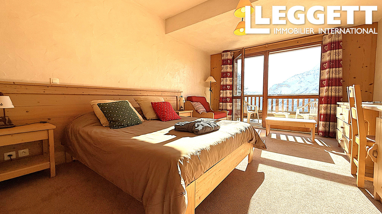 Un balcon exposé sud offre une vue imprenable sur Les Arcs et la vallée de la Tarentaise en direction de Tignes et Val d'Isère, vous permettant d'admirer le magnifique paysage montagneux. L'appartement dispose de deux places de parking réservées dans le garage intégré au chalet, garantissant un accès facile toute l'année.