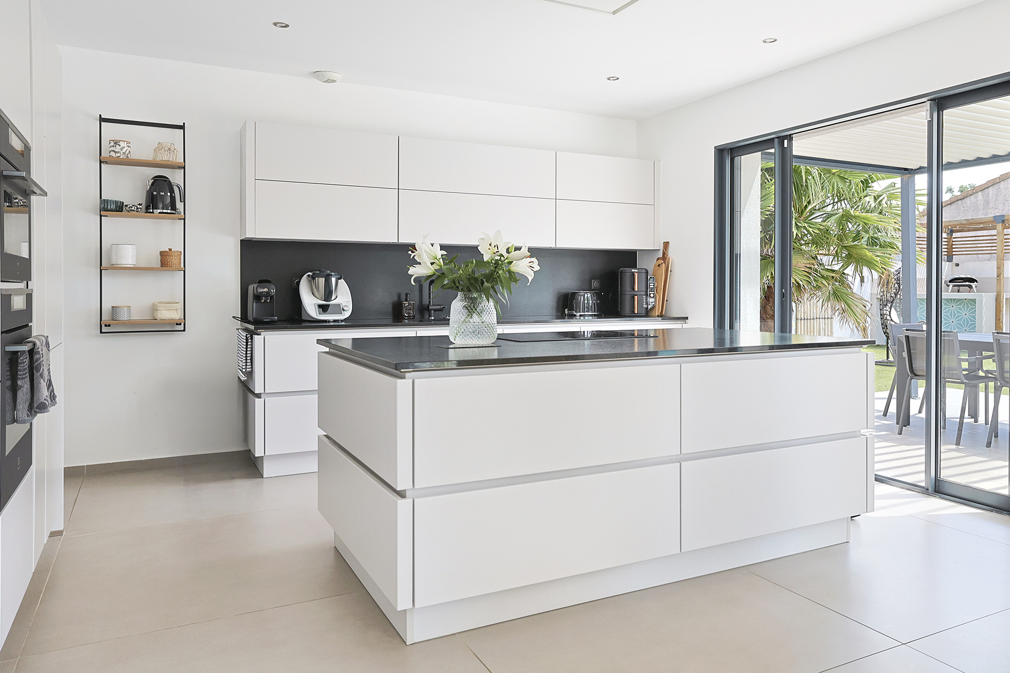Au rez-de-chaussée, l'entrée vous plongera dans un séjour baigné de lumière naturelle, une belle cuisine américaine de qualité avec plan de travail en granit noir, équipée avec des appareils haut de gamme, qui ravira les passionnés de gastronomie. Vous trouverez également une première suite parentale avec salle d'eau, WC et dressing privatifs, offrant un confort absolu. Arrière cuisine/cellier/buanderie, WC séparé et garage complètent ce niveau.