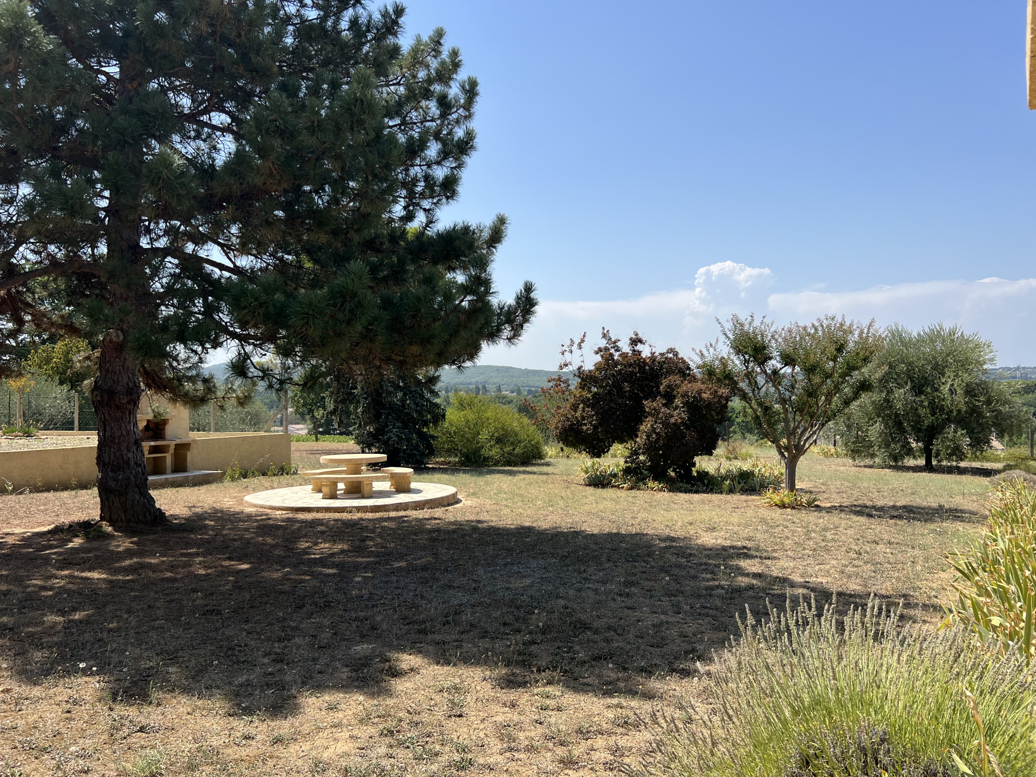 Le vaste terrain de 6185m2 se compose actuellement de 4 espaces distincts : l'espace jardin et parking qui entourent de près la maison, le 'parc' arboré avec une vue imprenable sur Saint-Paulet-de-Caisson idéal pour un moment détente ou jeux, l'espace hangar gravilloné, et enfin une oliveraie fermée comprenant une vingtaine d'oliviers.