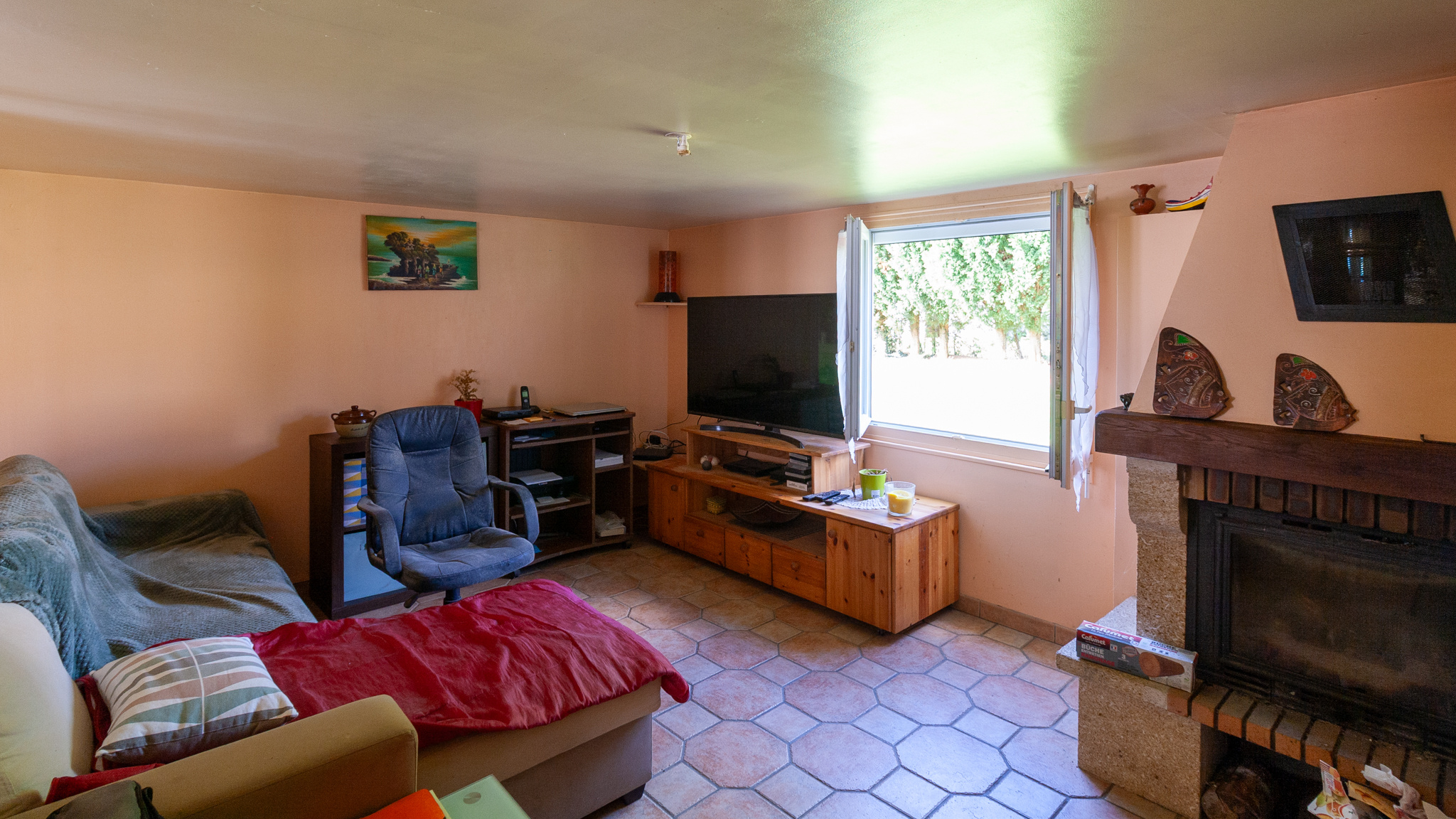 En passant par le sas d'entrée vitré, vous accèderez à une belle pièce de vie composée d'une cuisine ouverte, d'une salle à manger et d'un salon disposant d'un insert au bois.