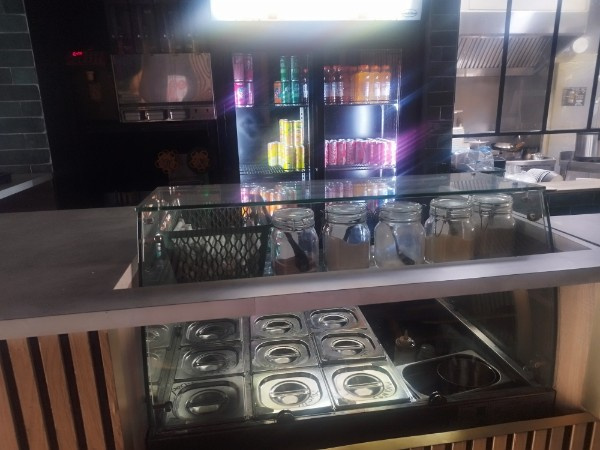 Comptoir moderne avec saladette réfrigérée et présentoir réfrigéré.