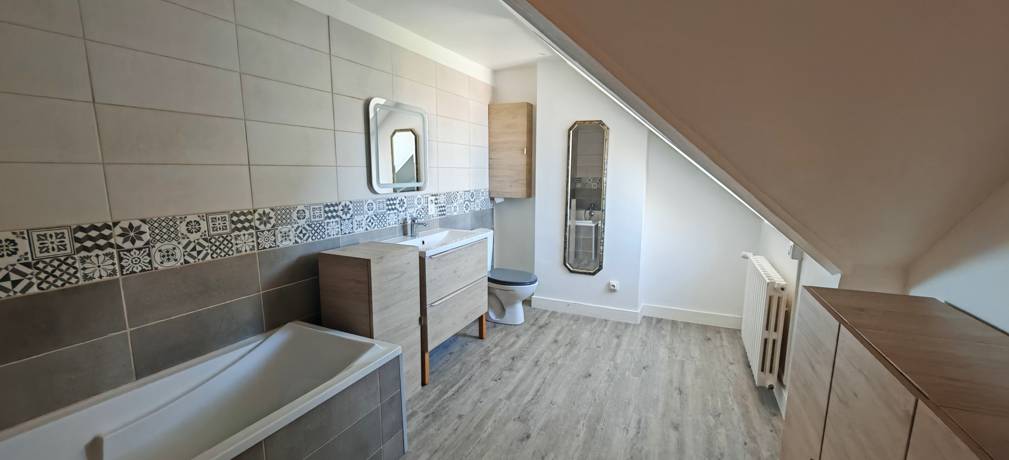 Une salle de bain de 7m2 avec baignoire et meuble simple vasque.