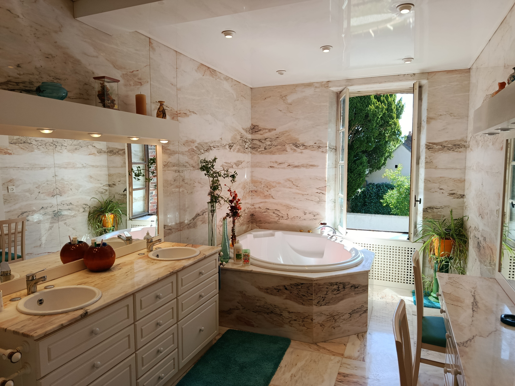 A l'étage, le palier lumineux dessert 3 chambres allant de 15 à presque 28 m2, une buanderie de plus de 16 m2 et une salle de bains (marbre) avec wc.