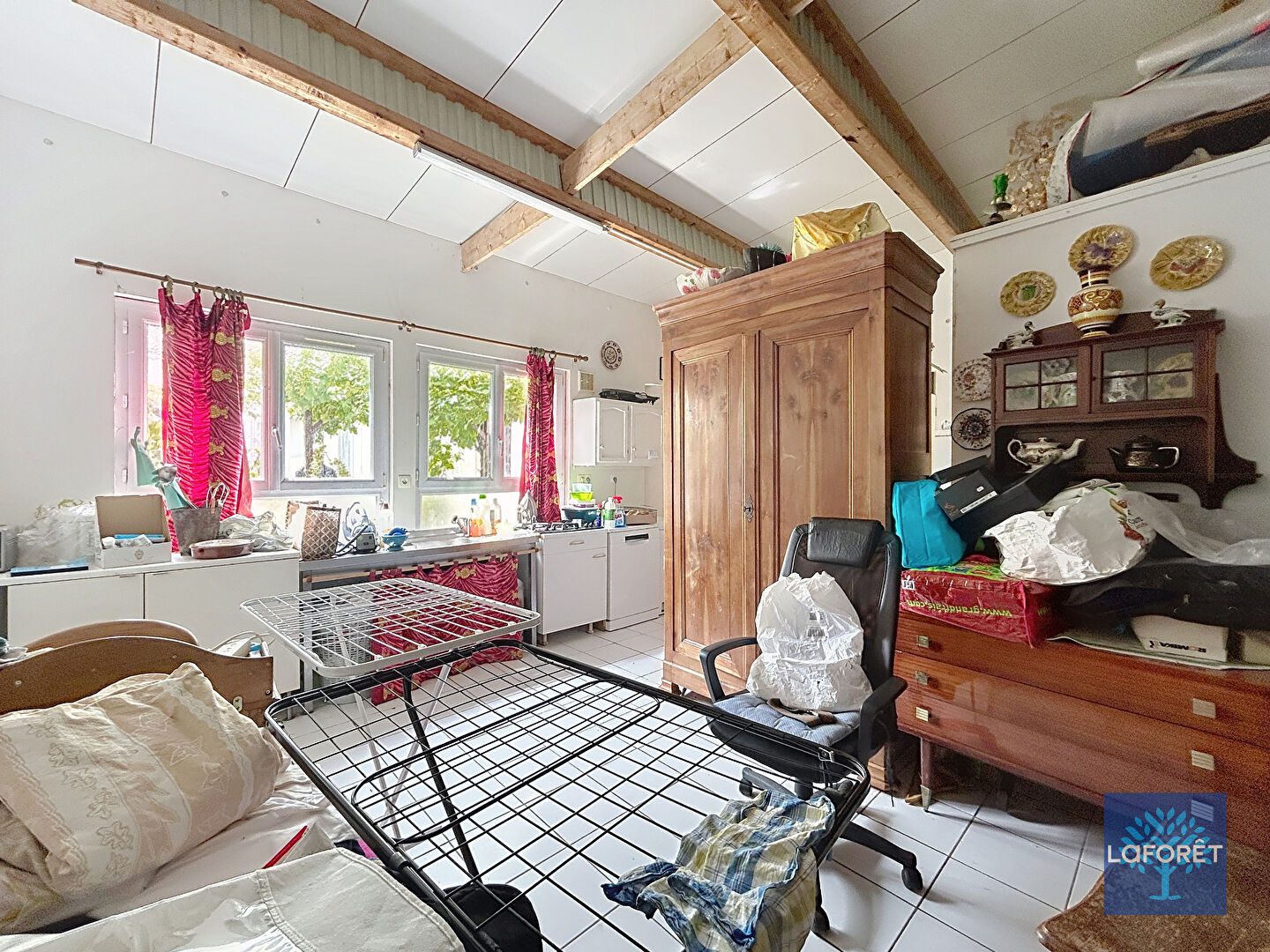 L'intérieur se compose d'un séjour, deux chambres, d'une salle d'eau avec WC, d'une cuisine avec arrière-cuisine et de plusieurs espaces annexes. Un grand atelier, parfait pour un usage professionnel, un bureau ou un projet artistique, ainsi que deux garages.