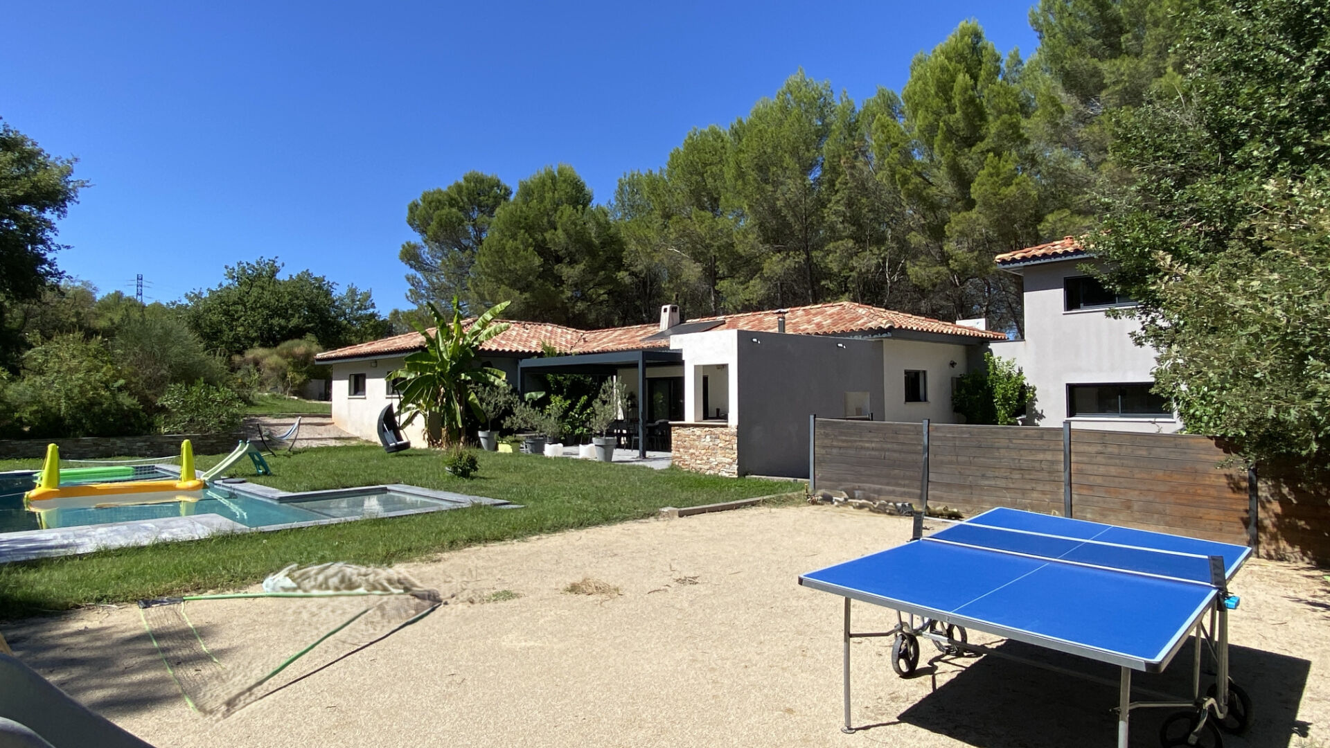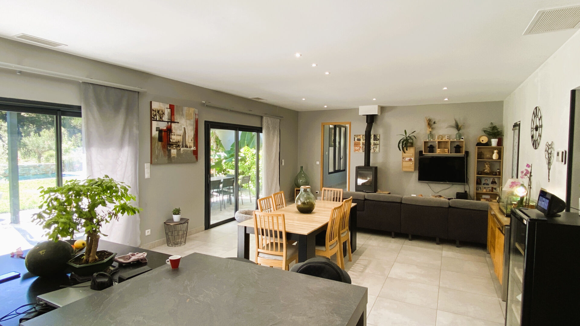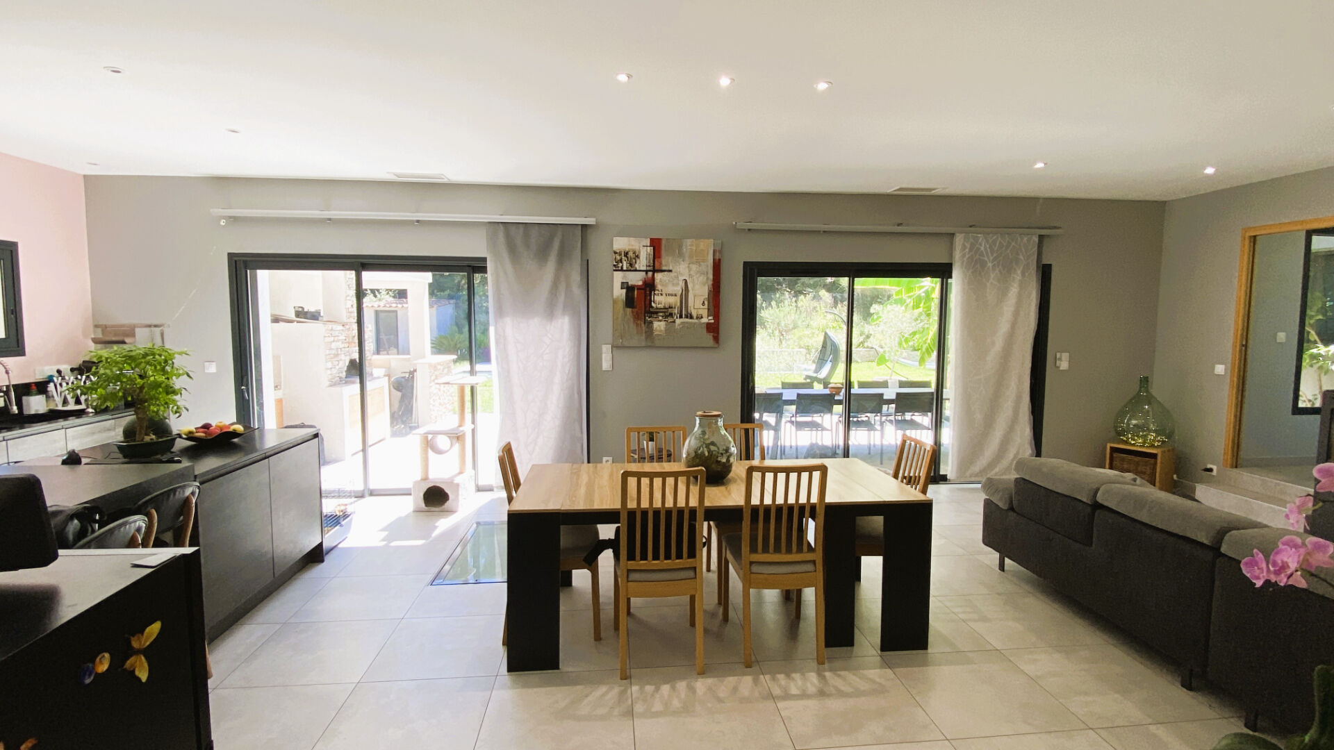 Située au coeur d'un quartier résidentiel calme et recherché, cette villa de 2015 offre des prestations et finitions de qualité, modernes et soignées. Essentiellement organisée de plain pied avec une chambre en étage, la maison offre un vaste espace séjour / cuisine exposé Sud ouvert sur le jardin et l'espace piscine, 5 chambres dont une suite parentale, 1 salle de bains et 2 salles d'eau. Idéale pour une famille nombreuse, une aile de la maison peut aussi être mise en location grace à une 2de cuisine déjà installée.