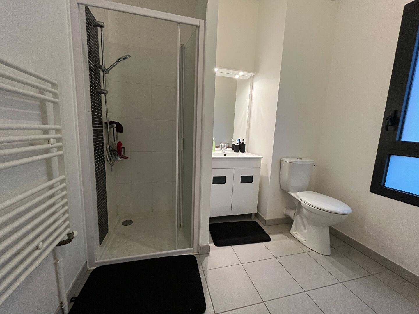 D'une salle de bain de 6 m² avec douche, lavabo et WC.