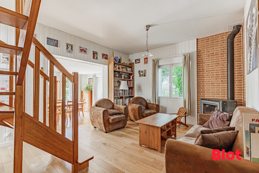 Au rez-de-chaussée, la circulation est fluide entre les espaces de vie, chacun ayant sa propre atmosphère : une vaste cuisine conviviale, une salle à manger baignée de lumière et tournée vers le jardin, et un salon chaleureux, accentué par un poêle pour les soirées cocooning.