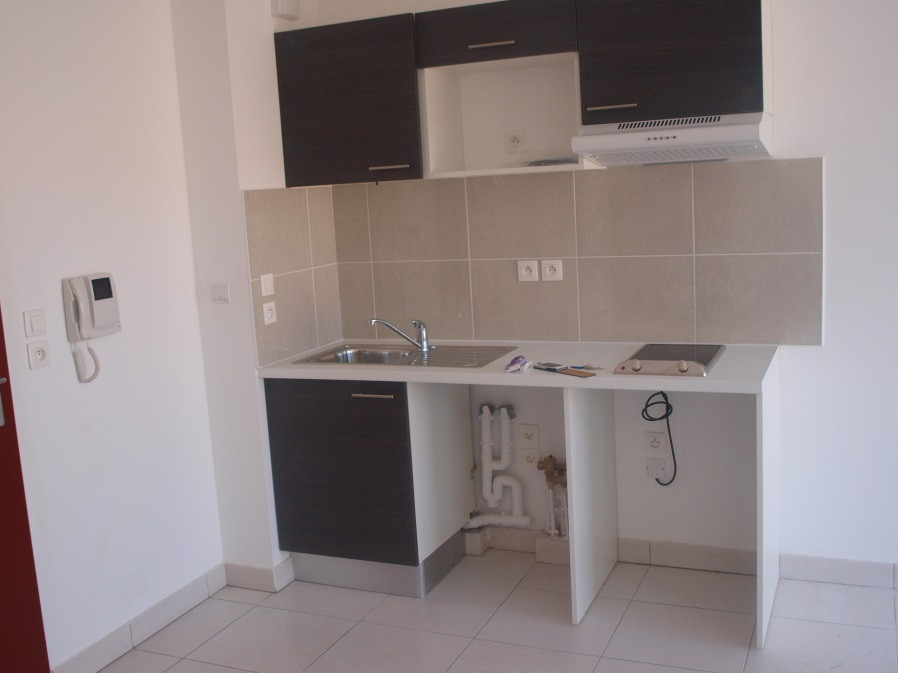 - Séjour lumineux avec cuisine semi-équipée (meubles de rangement, évier, hotte, plaque de cuisson).