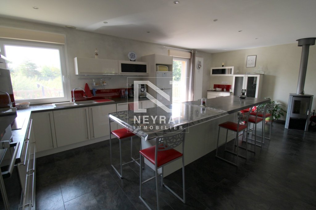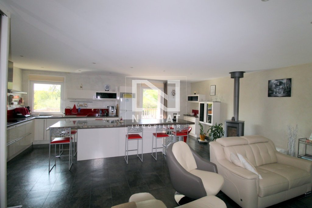 De plain-pied, vous accédez à un séjour double de 48m² ouvert sur une cuisine aménagée et équipée donnant accès à une terrasse de 45 m². La pièce de vie bénéficie d'un poêle à bois, source de chaleur et d'ambiance, et laisse entrer une belle luminosité grâce aux grandes ouvertures. La configuration en plain-pied facilite les circulations et l'usage quotidien.