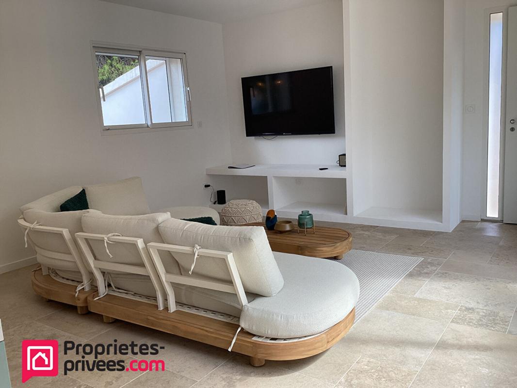 De plain-pied et baignée de lumière, elle déploie ses 94 m² autour d'un vaste séjour-salon avec cuisine américaine équipée, ouvert au sud sur l'extérieur. Chaque pièce principale s'ouvre sur la terrasse et la piscine, créant une parfaite continuité dedans/dehors.