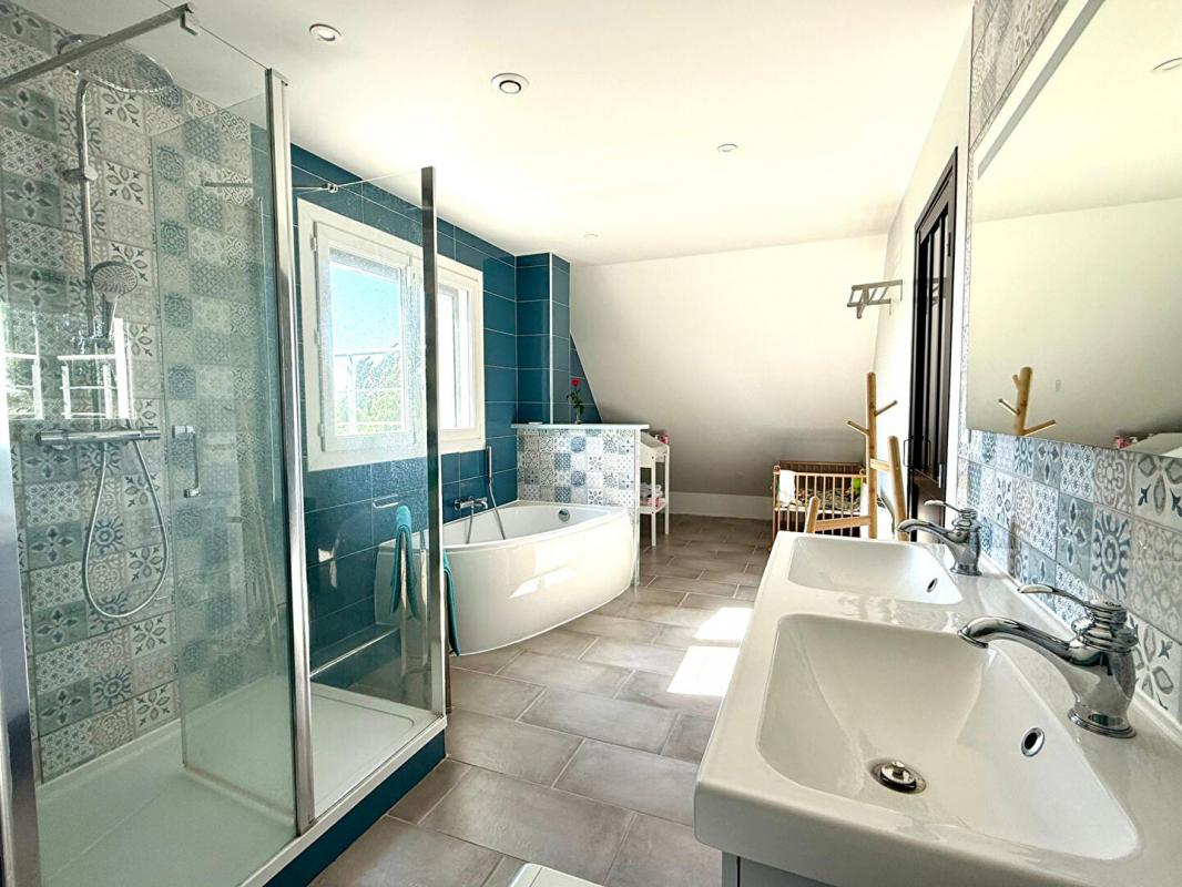 A l'étage, une grande pièce palière dessert 3 autres belles chambres décorées avec goût et une salle de bain spacieuse, baignoire, douche, double vasque et buanderie.