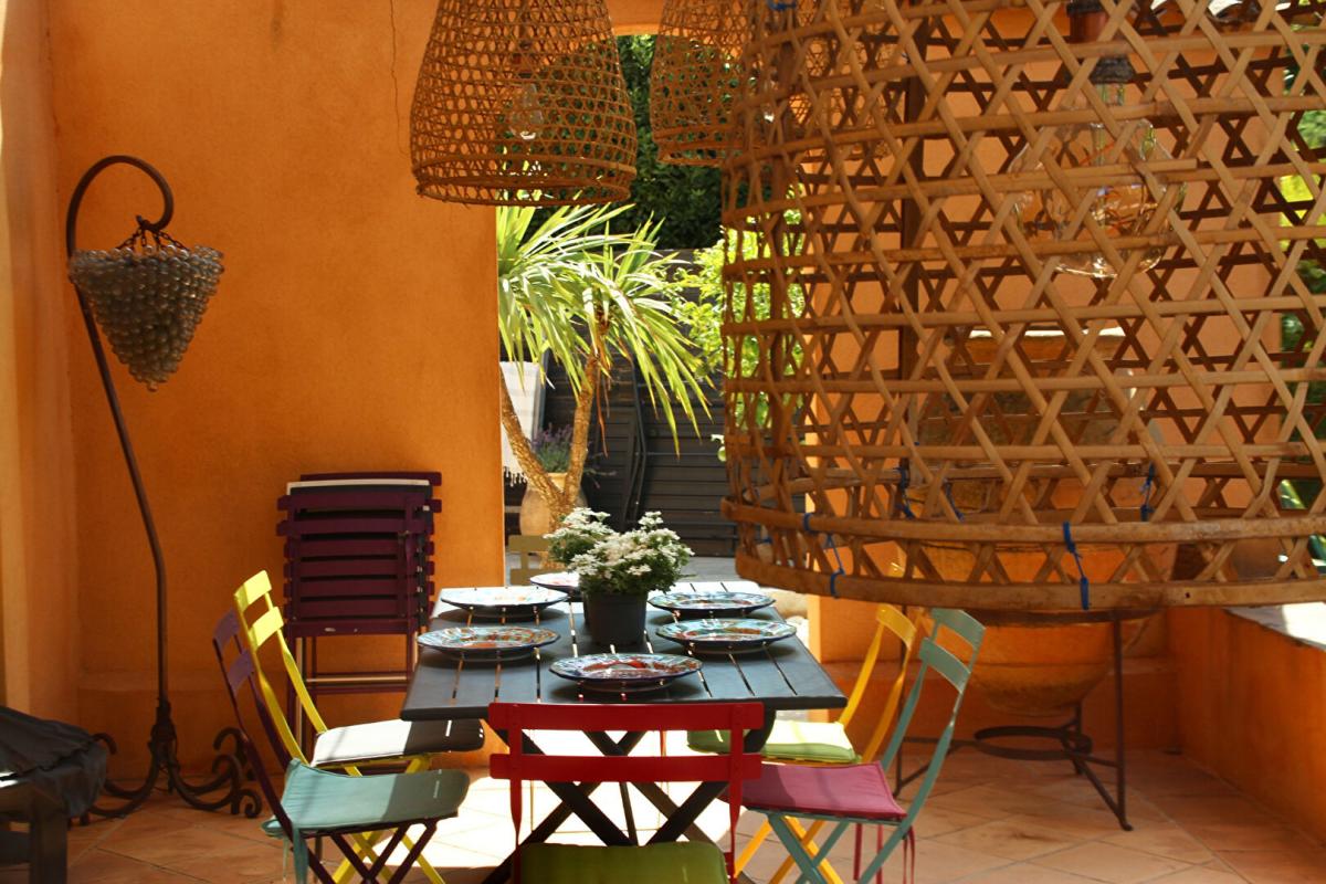 Passé le jardin d'accueil et sa terrasse repas de 45 m2, la maison offre, en rez de jardin, une entrée, une cuisine aménagée sur mesure et équipée, un cellier, un salon-séjour avec poêle à bois, des WC. Du salon on accède à une seconde vaste terrasse pour les apéritifs avec une cuisine d'été face à la piscine.