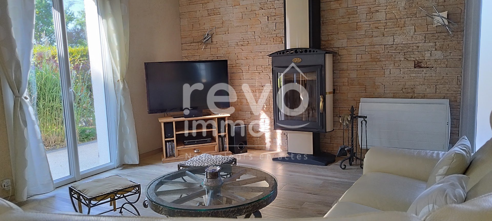 Un salon-séjour lumineux de 38 m² équipé d'un poêle à bois.