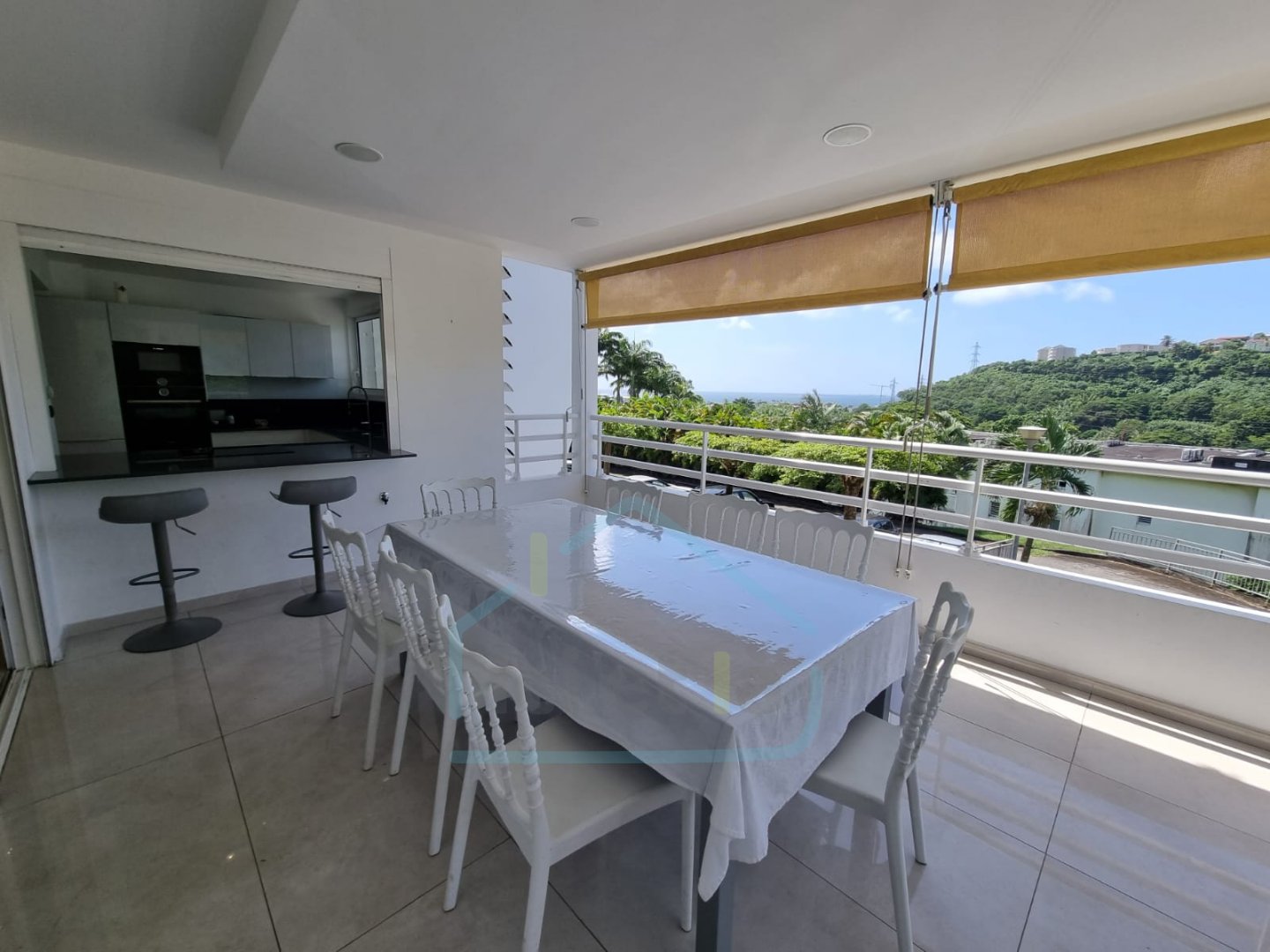 1 se´jour climatisé auquel s'ajoute une cuisine ouverte, 3 chambres climatise´es avec placard, 2 salles d'eau, 1 WC se´pare´, 1 buanderie. Une varangue de 22,5m2 avec vue mer complète le bien.