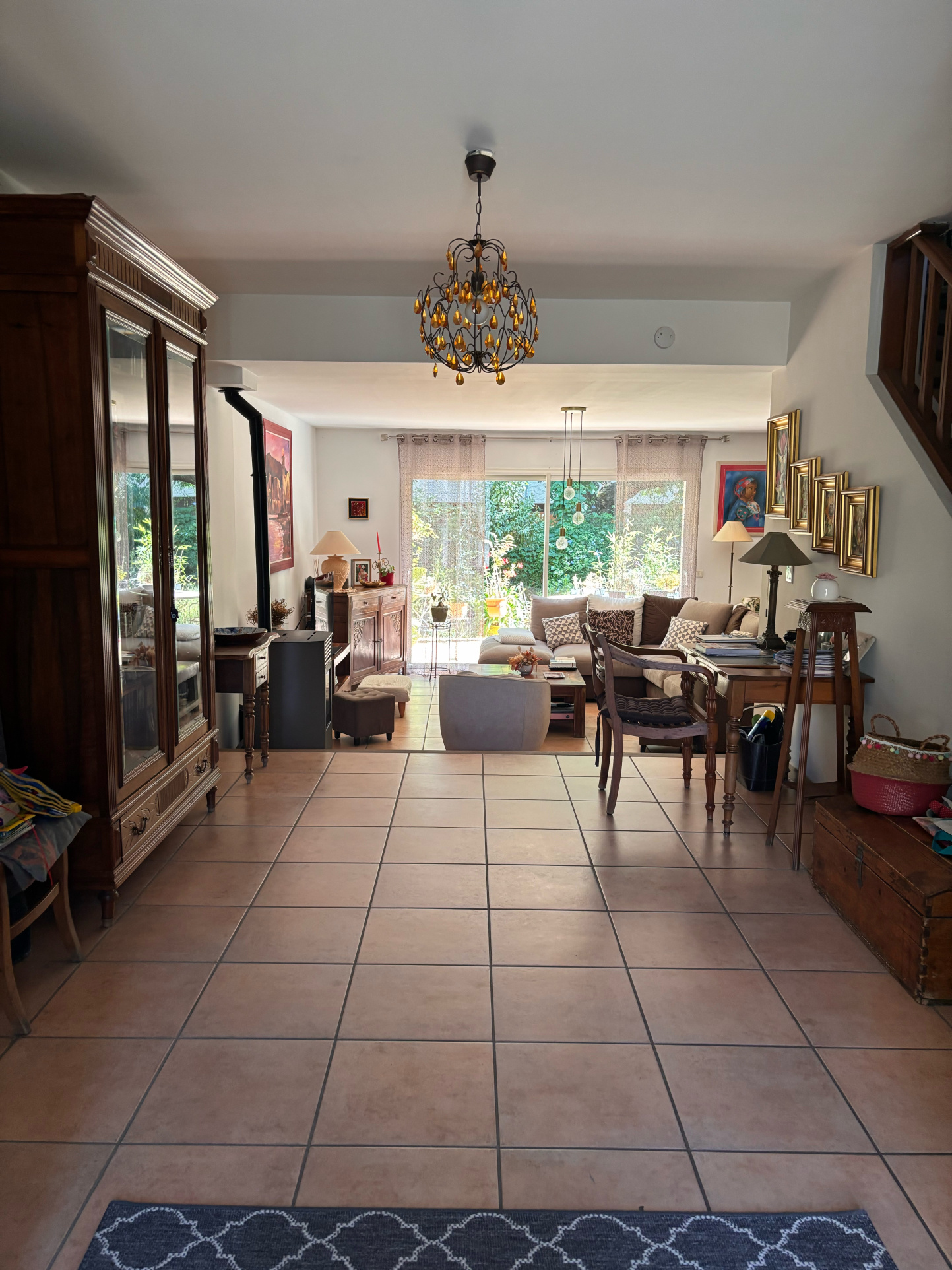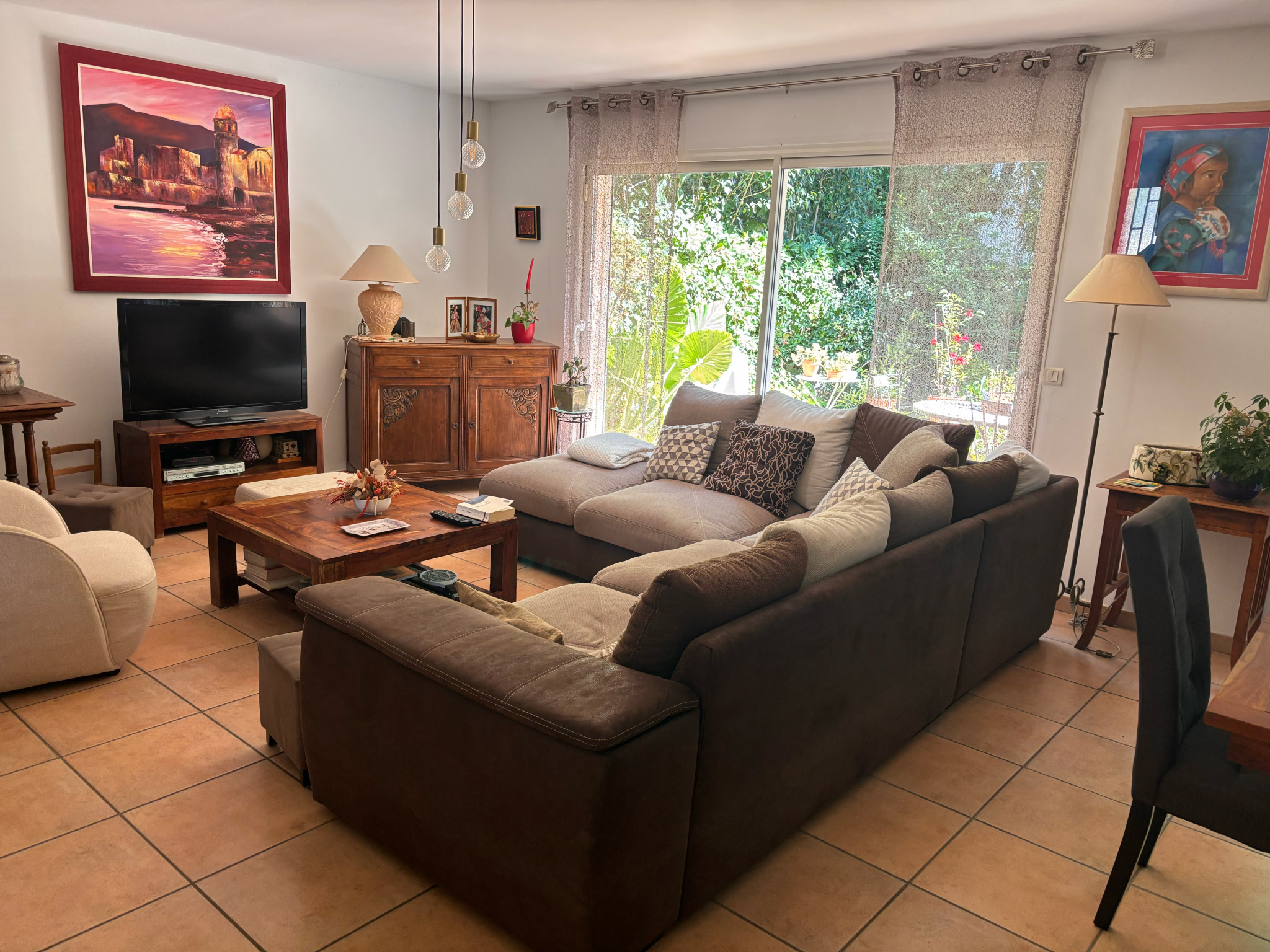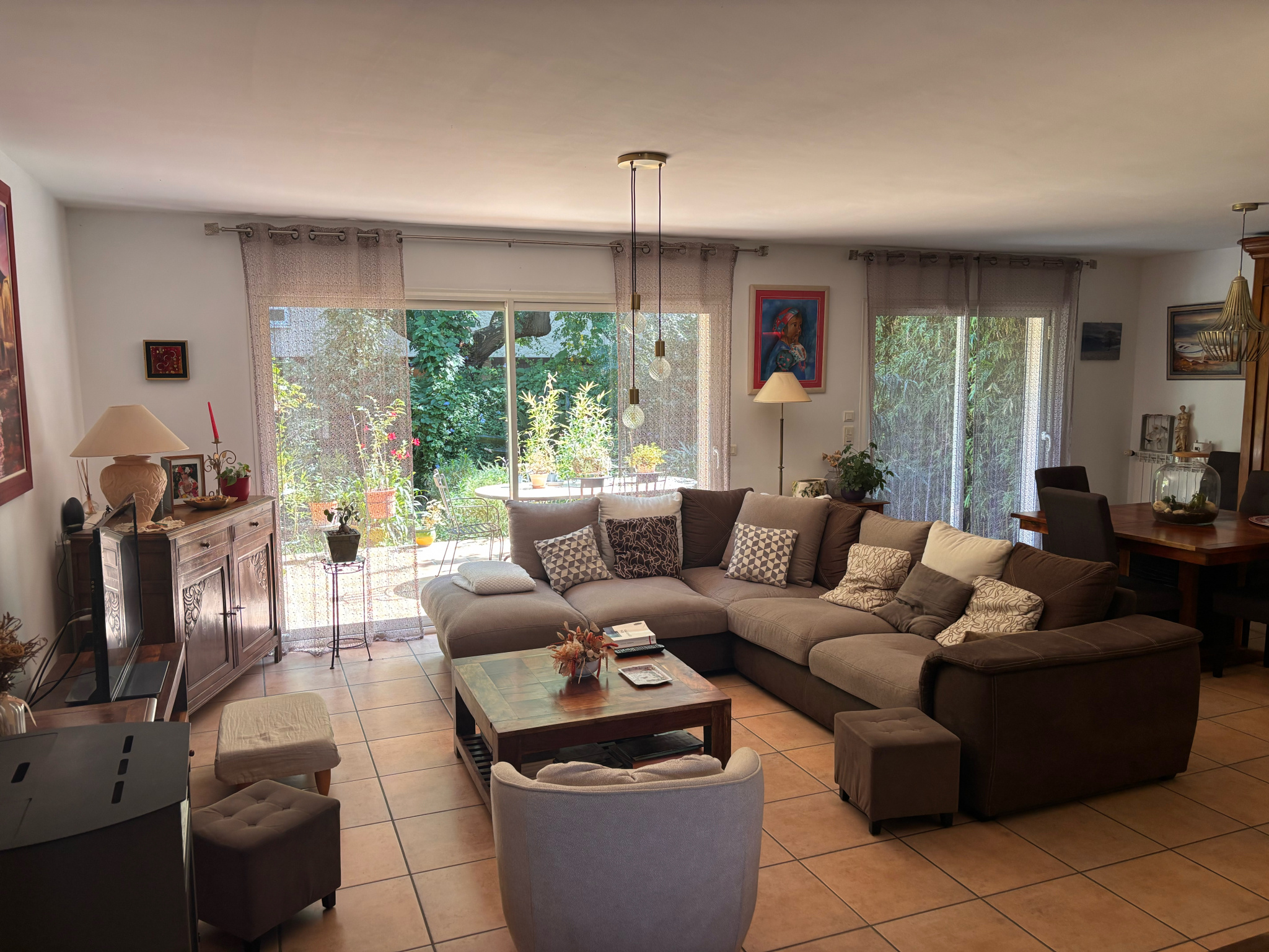 Charpente métallique et tuiles maçonnées / Chauffe-eau thermodynamique / Pompe de relevage. Cette maison combine volume, confort et praticité dans un environnement agréable.
