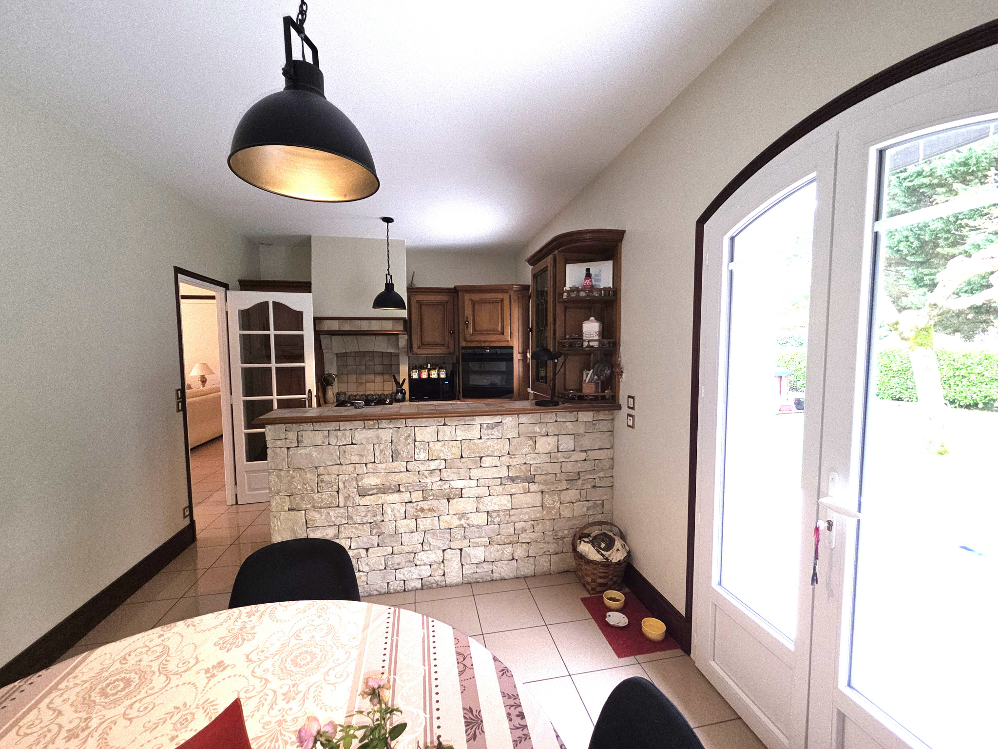 Dès l'entrée, vous découvrirez une vaste pièce de vie où la hauteur sous plafond sublime la clarté des lieux et permet d'accueillir élégamment meubles anciens et décoration moderne. La cuisine, réalisée en bois de qualité et entièrement équipée, offre un chaleureux espace repas propice aux moments conviviaux et s'ouvrant sur une terrasse abritée par deux grand stores électriques.
