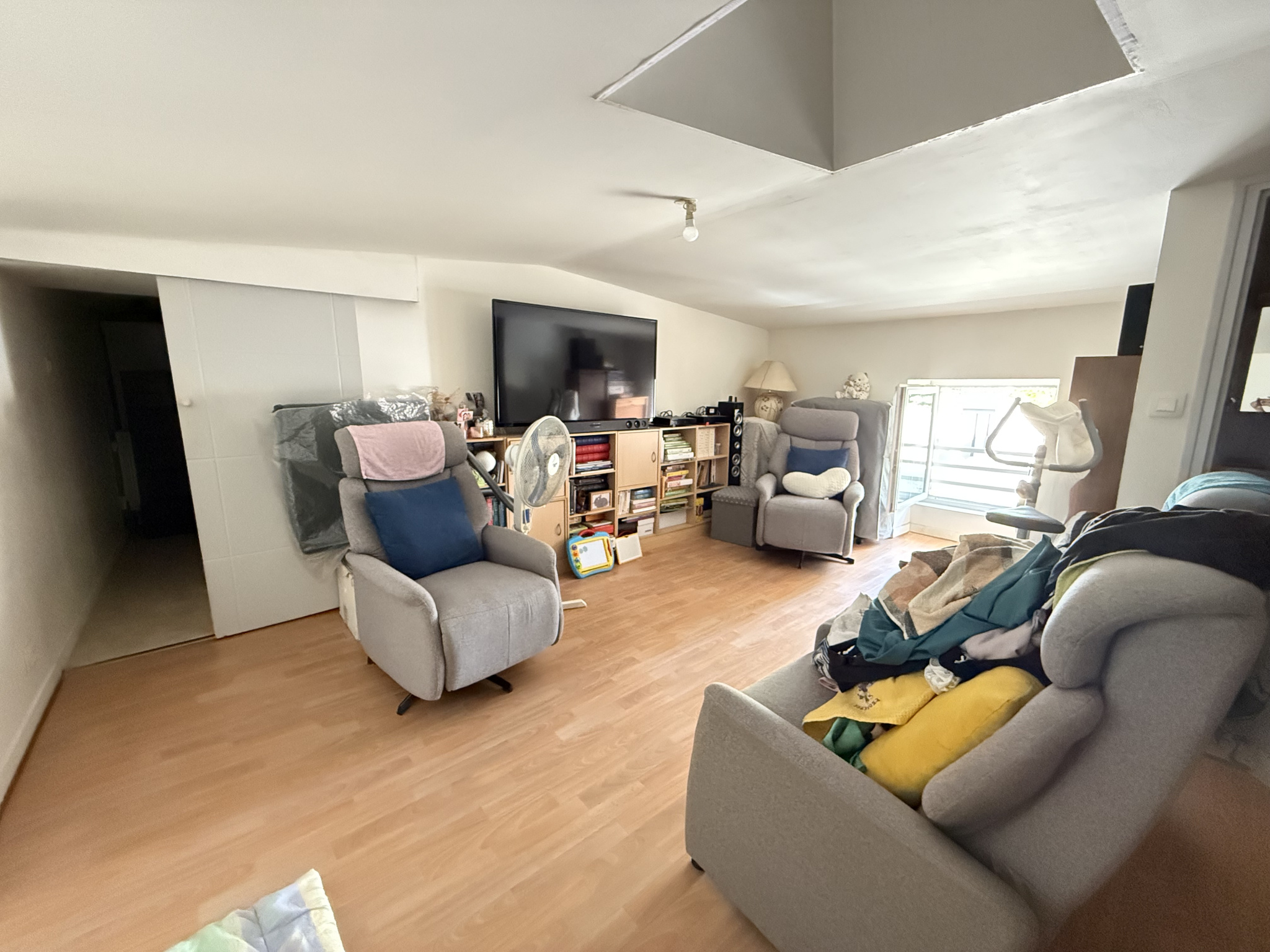 -T3 (47.39 m2 habitables) de plain-pied comprenant: salon, chambre, cuisine simple et arrière cuisine avec accès terrasse (privative) et terrain commun, salle d'eau avec WC. Grenier avec accès extérieur