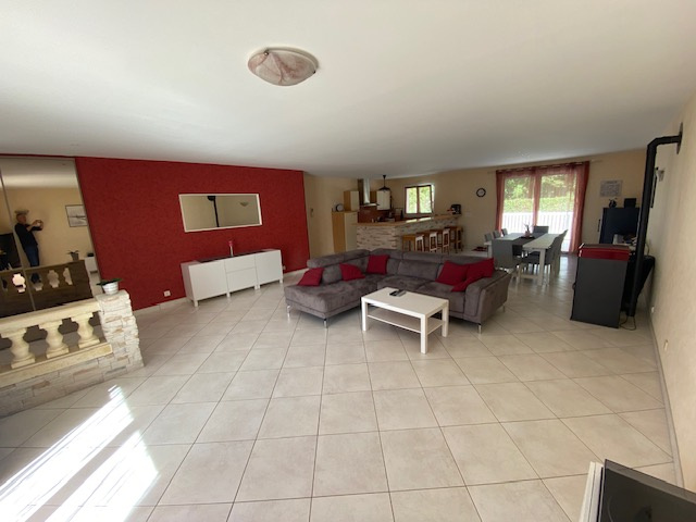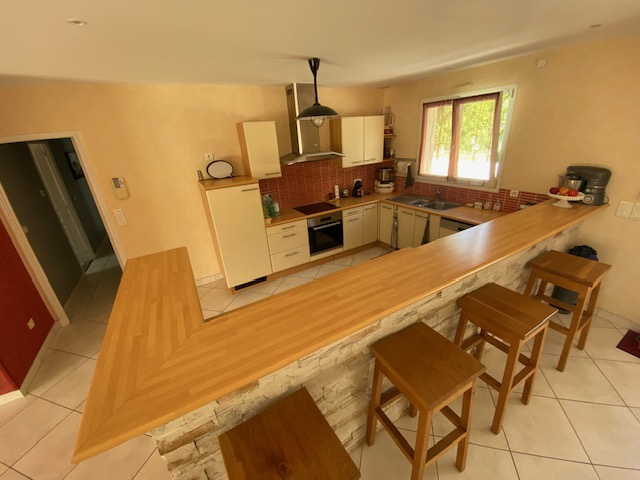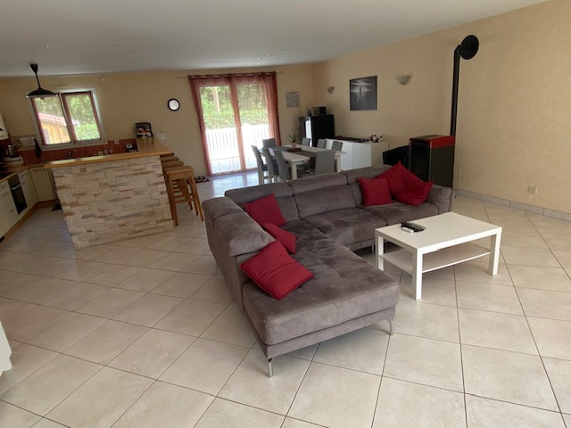 La maison comprend de plain-pied : entrée/cuisine ouverte (équipée en nombreux éléments de rangements et appareils électro-ménagers) donnant sur belle pièce de vie (68 M2 au total) + 4 chambres (de 11,55 M2 à 15 M2) + salle de bain + 2 WC + buanderie/cellier + garage (45 M2) ; une 5ème chambre ou bureau a été aménagée au dessus du garage .