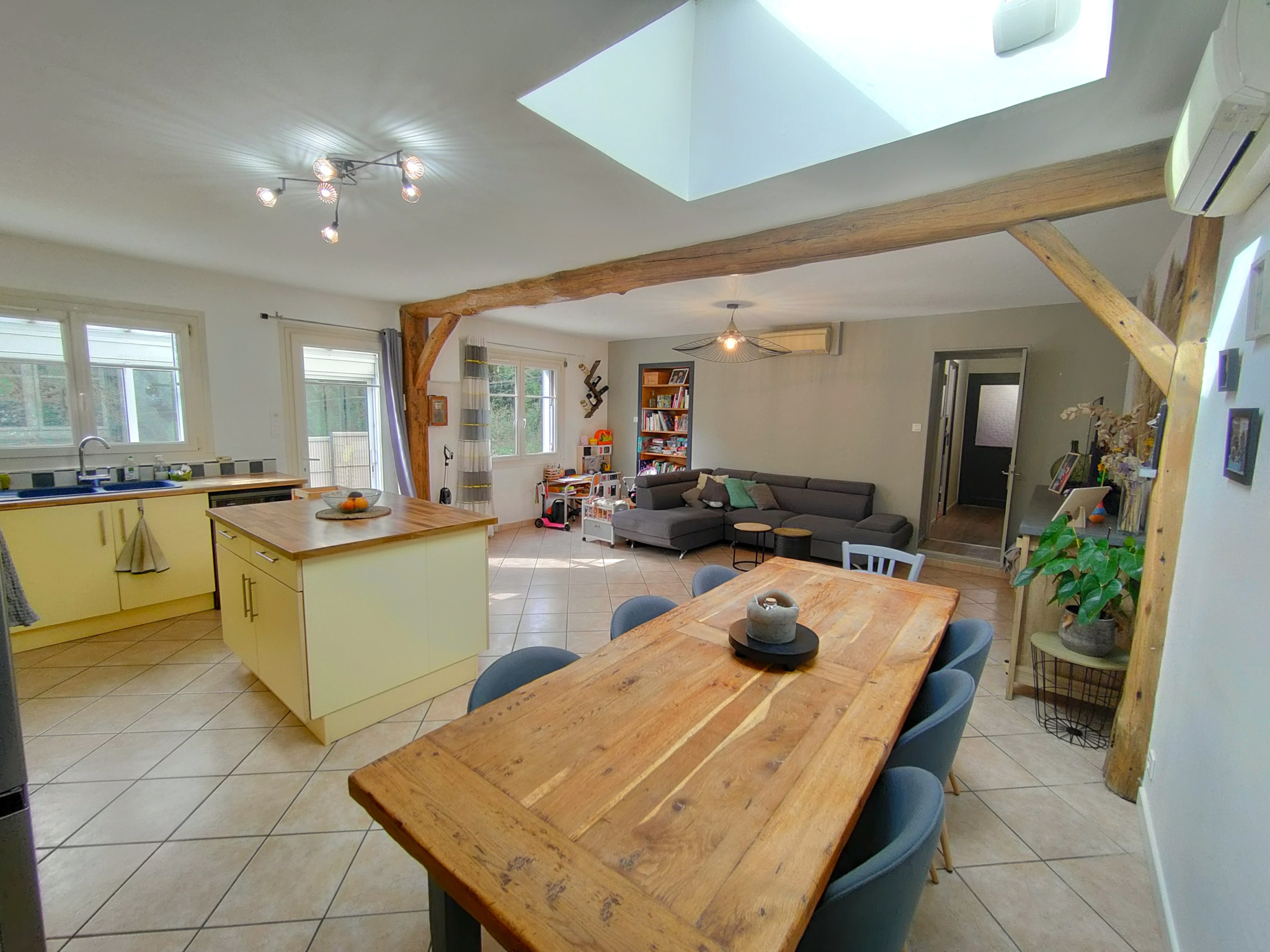 Environnement calme et boisé pour cette maison comprenant au rez-de-chaussée: une grande pièce de vie d'environ 38m2, avec cuisine ouverte, aménagée et équipée, un dégagement desservant une grande chambre avec placards, une salle d'eau récente et un wc indépendant.