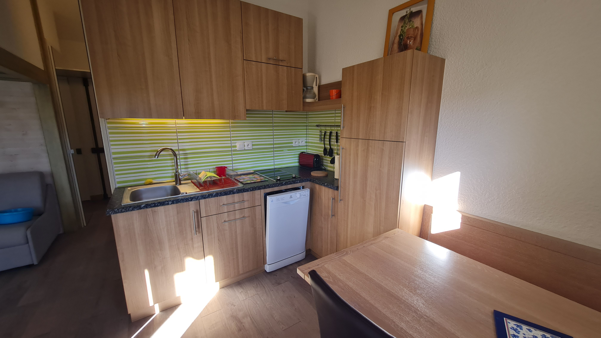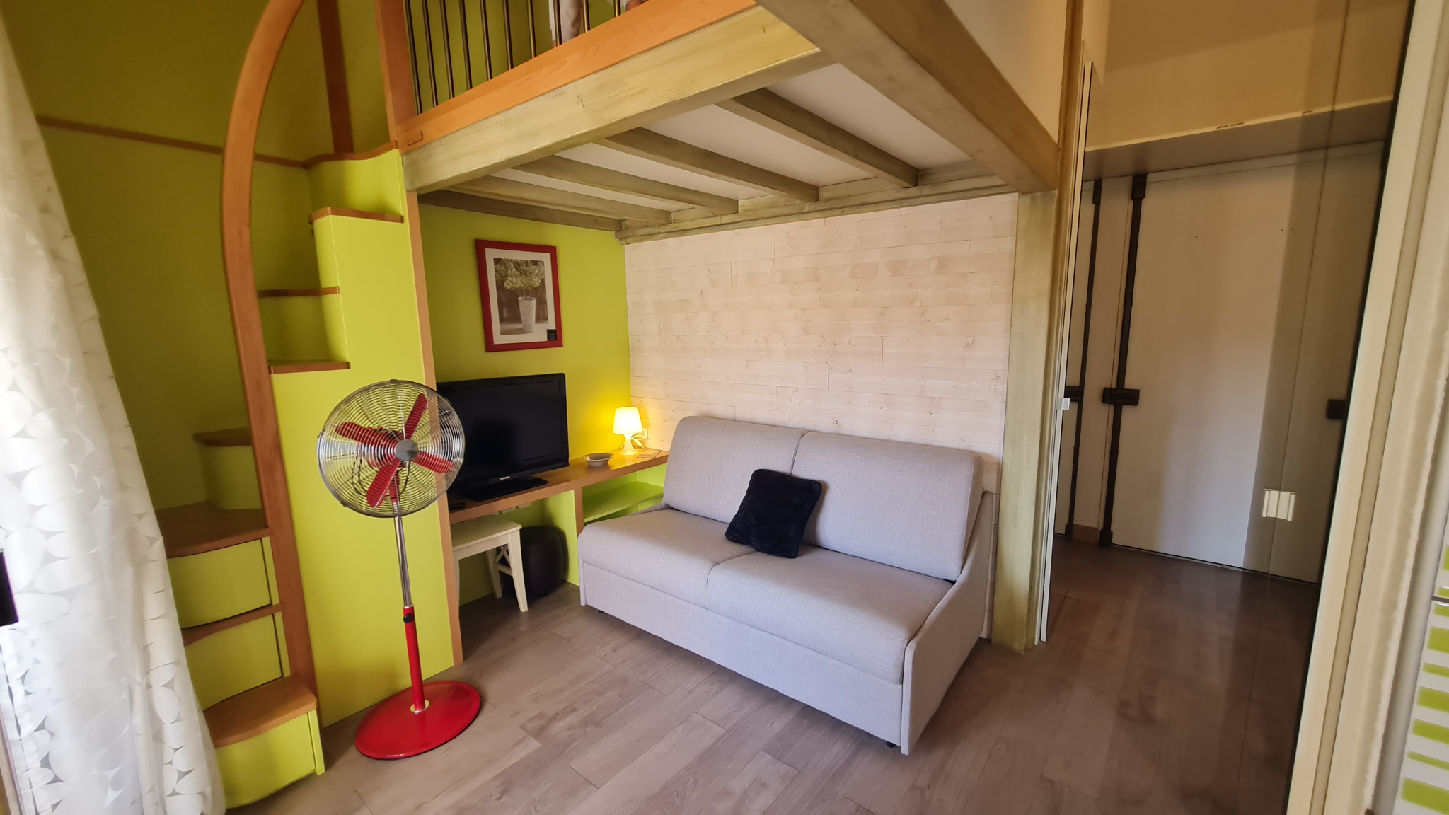 Il comprend une entrée, une chambre cabine, séjour, cuisine américaine équipée, une mezzanine à usage de deuxième couchage, une salle d'eau avec toilettes, balcon.