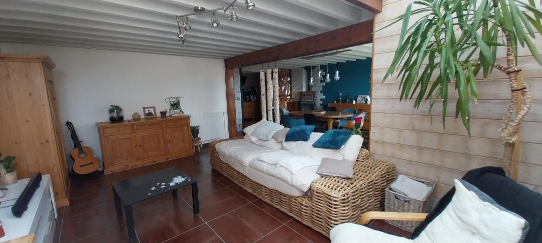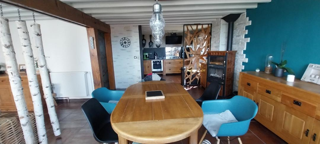Elle est composée: d'une entrée, une superbe pièce à vivre comprenant:cuisine équipée/salon/séjour avec poêle à bois, 4 chambres, une salle d'eau, une buanderie,deux wc, une pièce de rangement ou bureau, une véranda avec accès à une terrasse exposée SUD/OUEST et au terrain. Un atelier et une cave sur vide sanitaire viennent compléter ce bien.