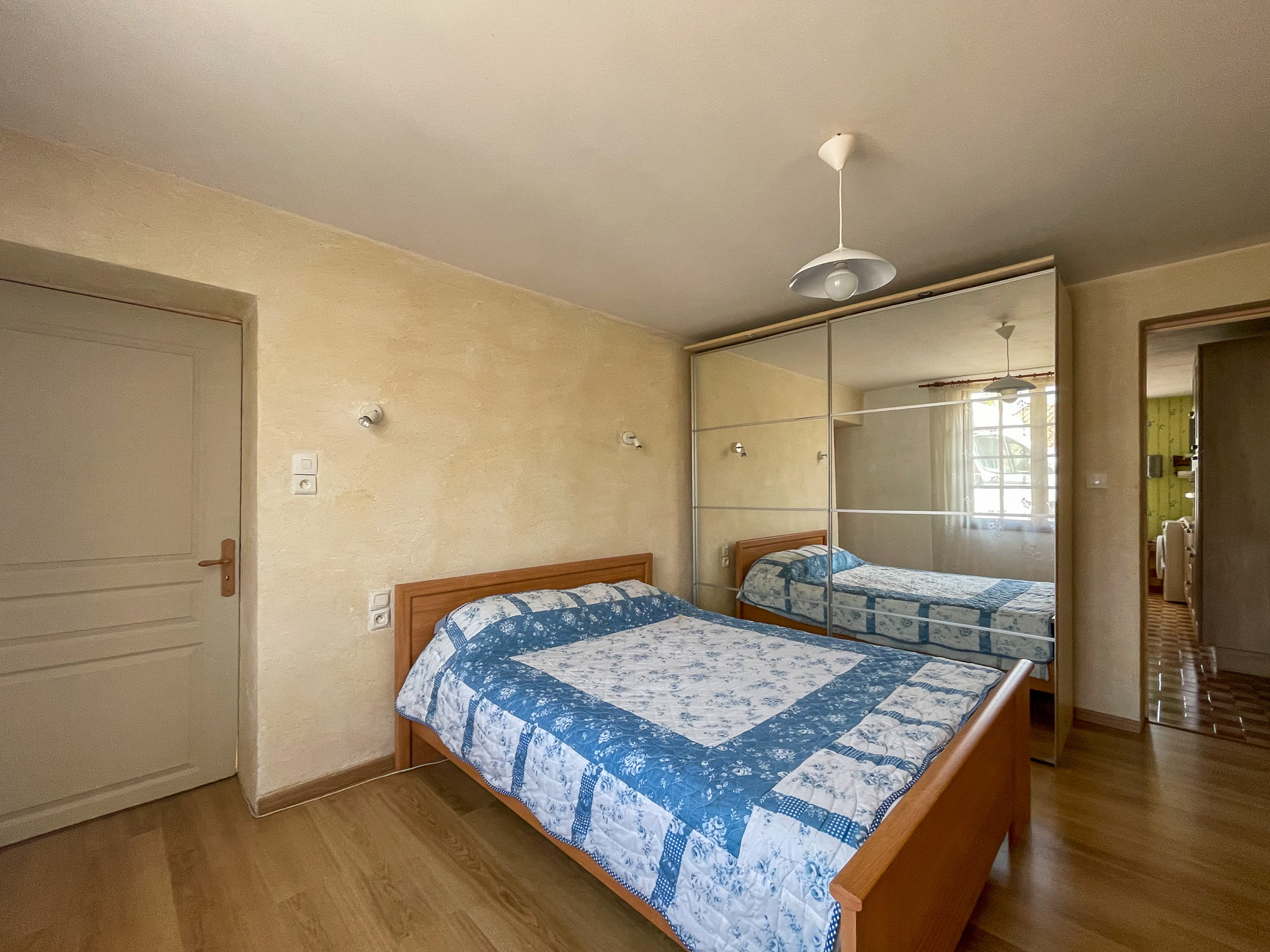 L'intérieur se compose d'une pièce d'accueil, d'une cuisine semi-équipée, d'un double séjour lumineux d'environ 30 m2, et de trois chambres, dont une d'appoint pouvant faire office de bureau. Une salle d'eau complète l'ensemble. La maison, entretenue mais à rénover, dispose de menuiseries bois simple vitrage, d'un chauffage au gaz, et d'une installation électrique à remettre aux normes.