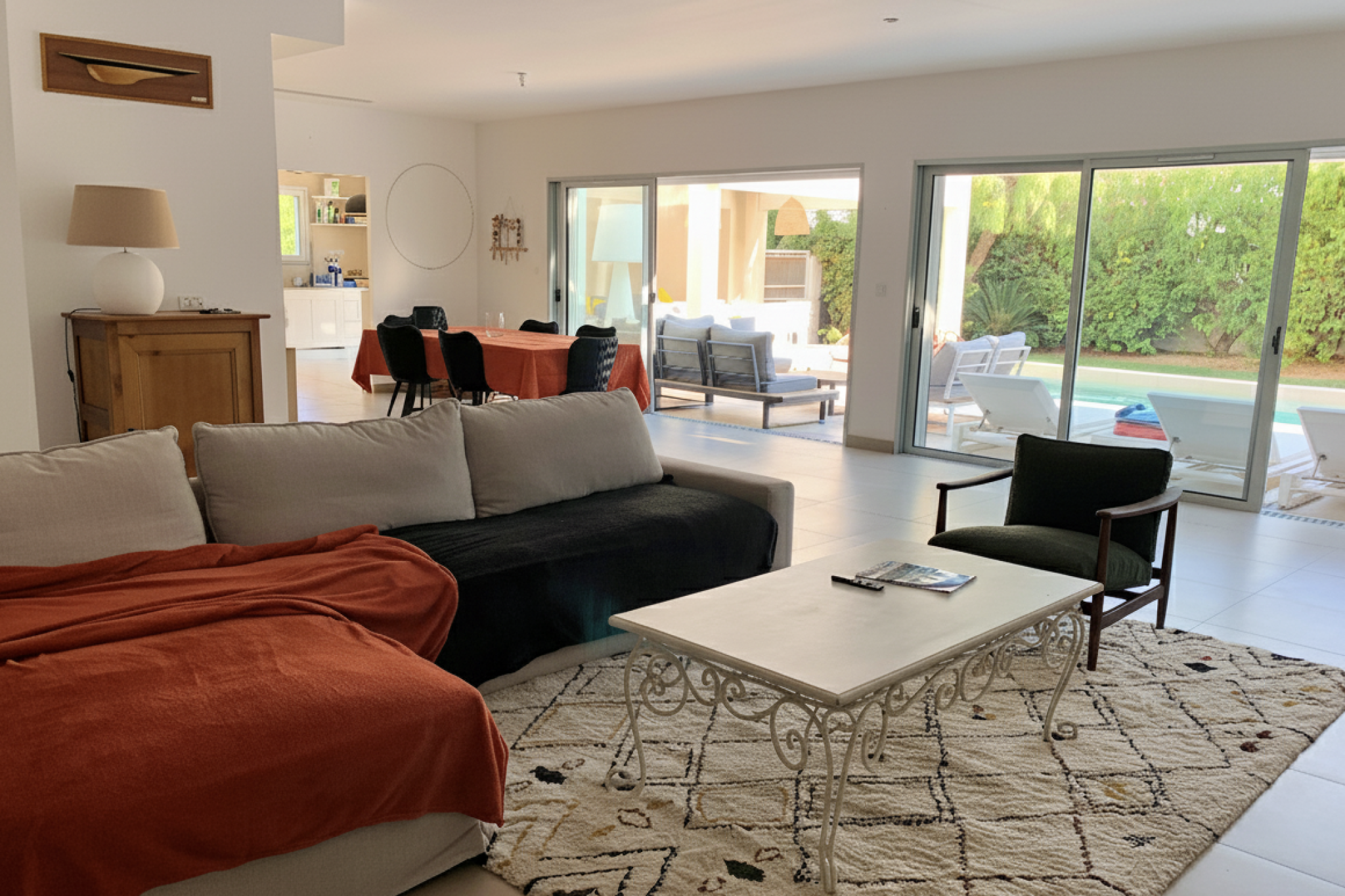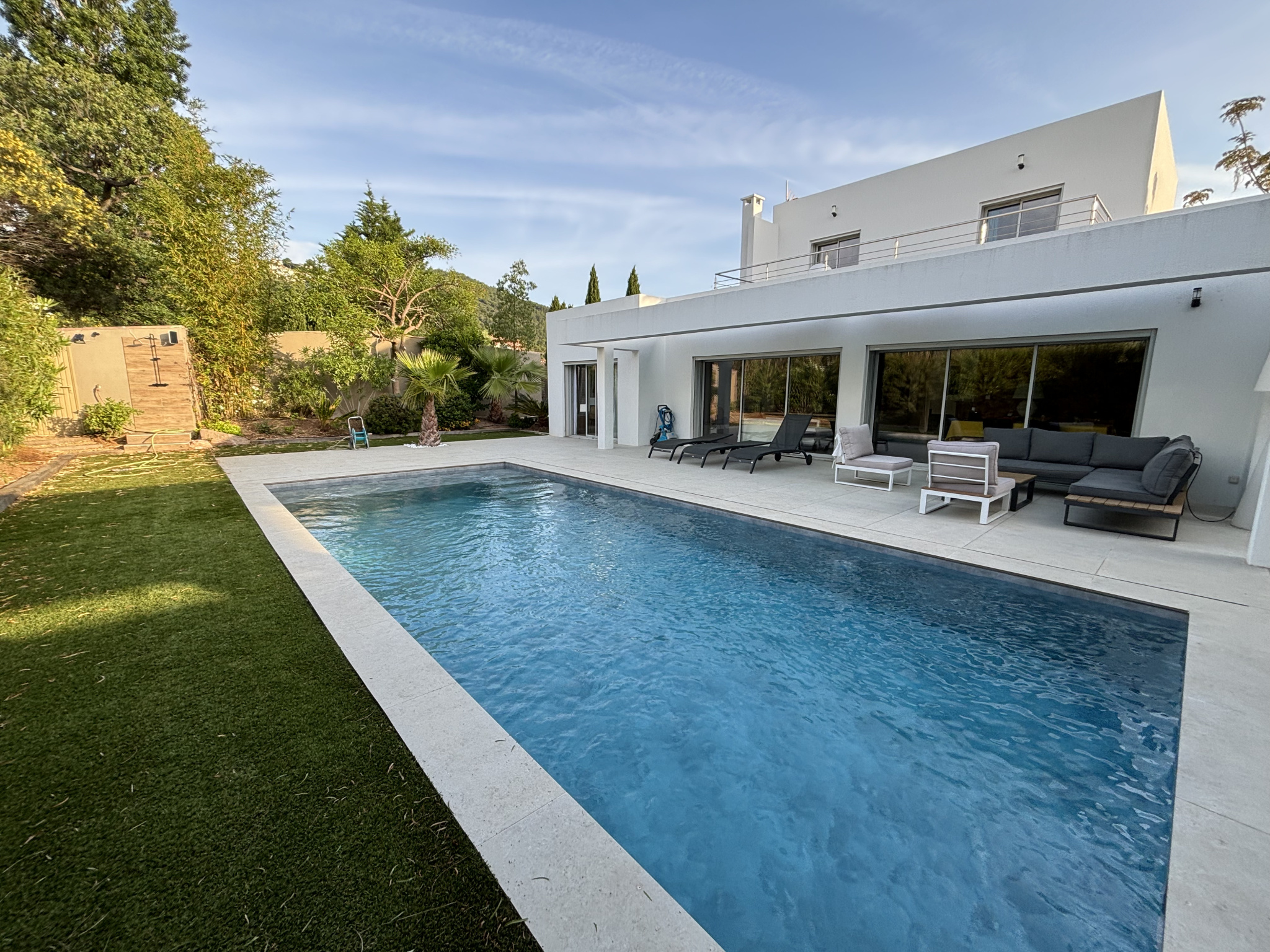 À vendre dans le très prisé quartier de l'Almanarre, élégante villa d'une superficie de plus de 165 m2. Idéalement située en impasse, cette propriété offre de plain-pied une vaste pièce de vie de plus de 65 m2, baignée de lumière grâce à de larges baies vitrées ouvrant sur une terrasse agrémentée d'une piscine. Vous y trouverez également une cuisine semi-ouverte, un bureau ainsi que deux chambres disposant chacune de leur salle d'eau.