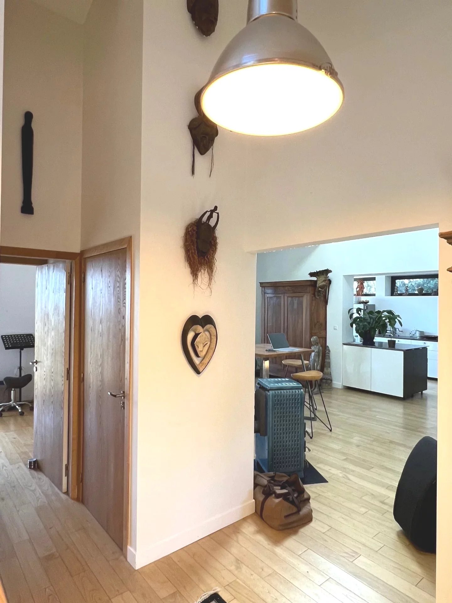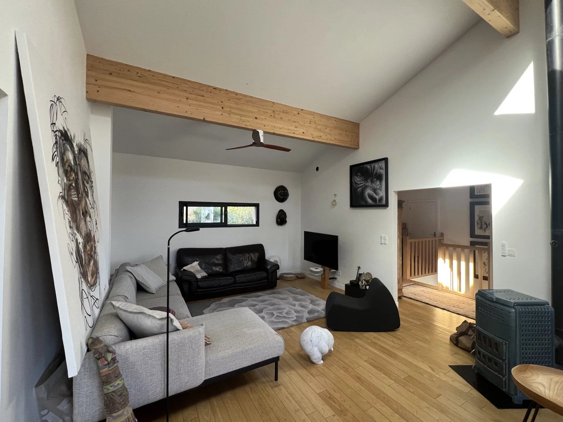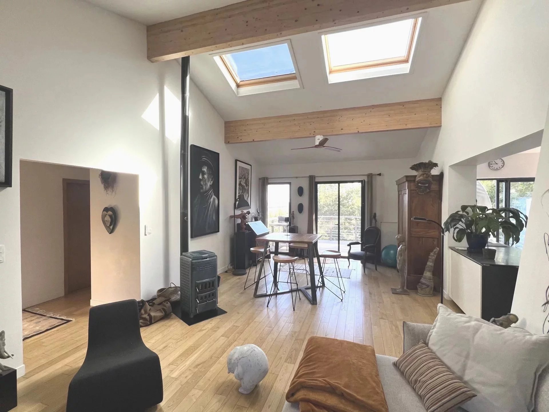 Dès l'entrée et dans toute la maison, vous noterez de très belles finitions : parquet châtaignier huilé, fenêtres alu, velux automatisés, chauffage au sol...