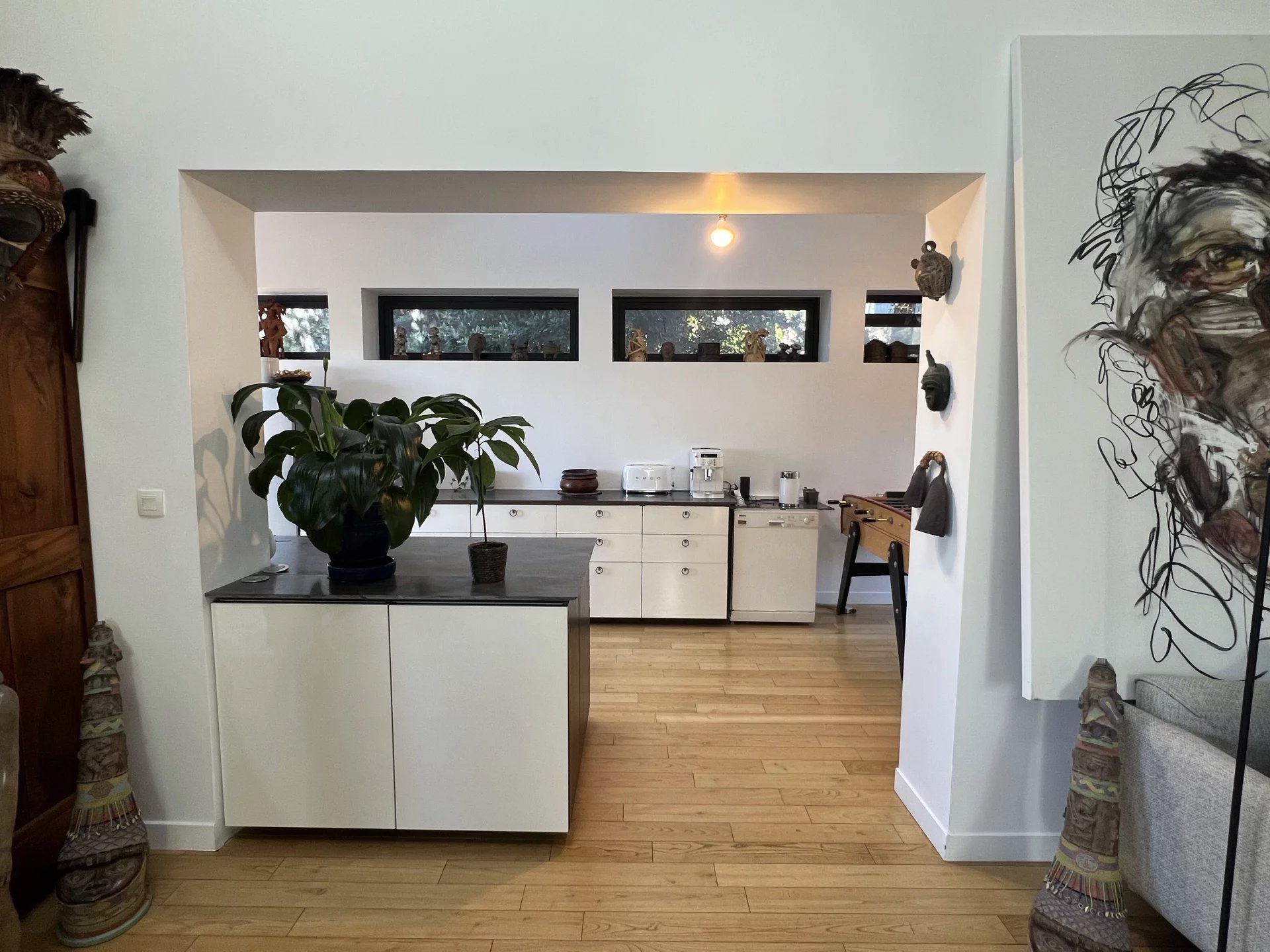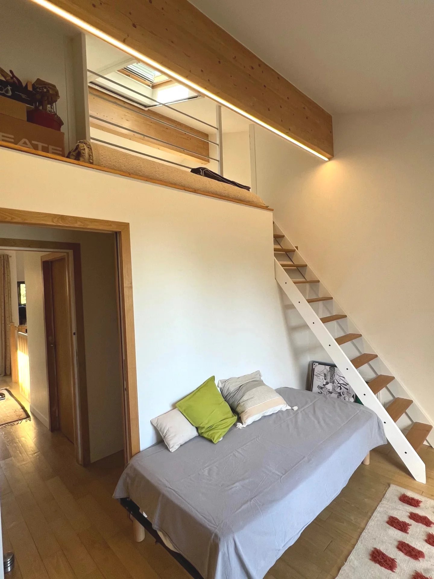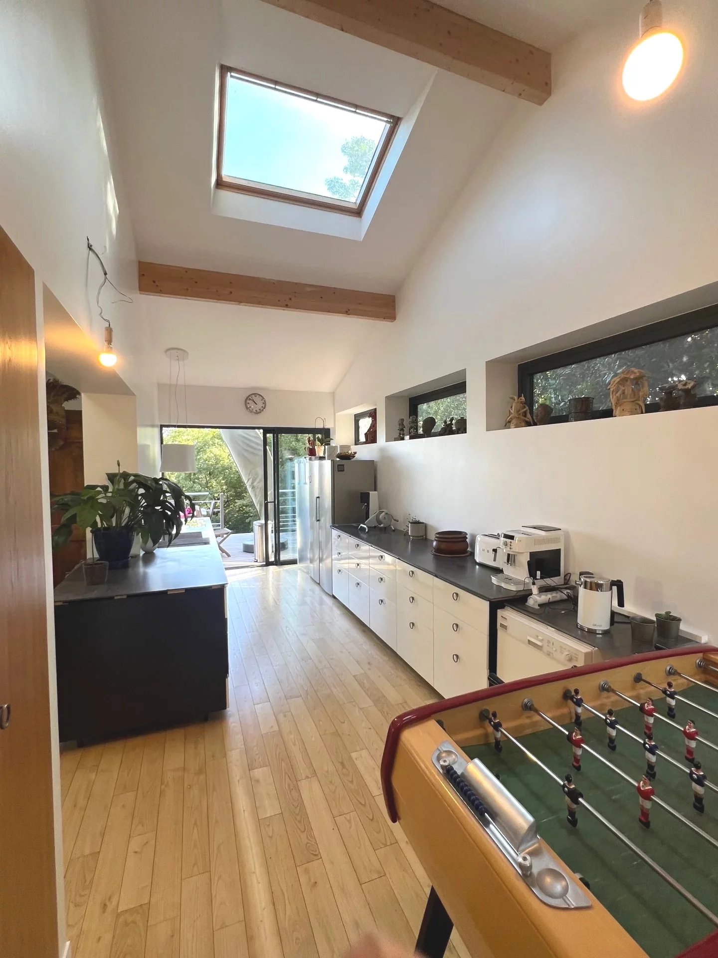 Dès l'entrée et dans toute la maison, vous noterez de très belles finitions : parquet châtaignier huilé, fenêtres alu, velux automatisés, chauffage au sol...