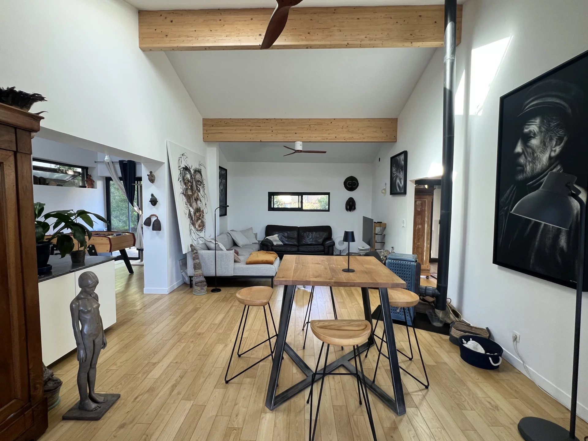 Ayant bénéficié d'un très bel aménagement, elle vous offre 4 chambres dont 2 avec mezzanine, un bureau et un magnifique espace de vie de plus de 60m2 donnant sur la terrasse et offrant une vue sur son jardin arboré de 2500m2, sans vis-vis et avec piscine. Une buanderie, un cellier, un atelier et un garage vous offrent des espaces complémentaires.
