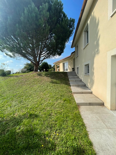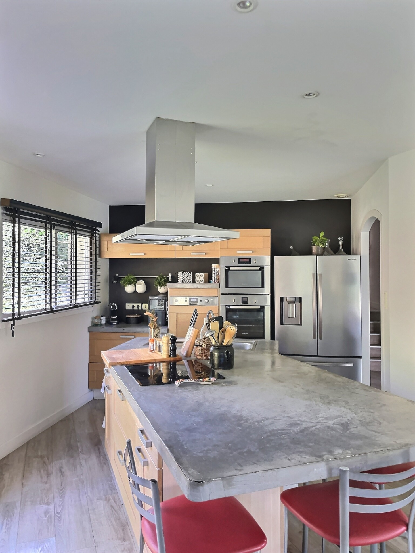 - un vaste séjour avec cuisine ouverte fonctionnelle et équipée(70m2) donnant sur la terrasse couverte et le jardin.