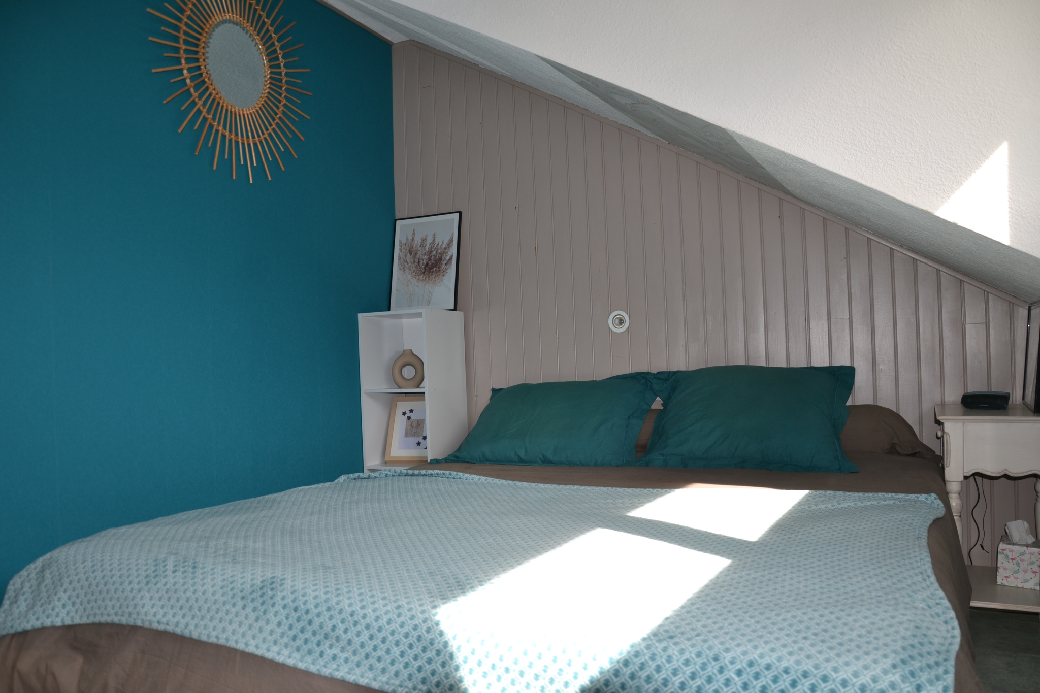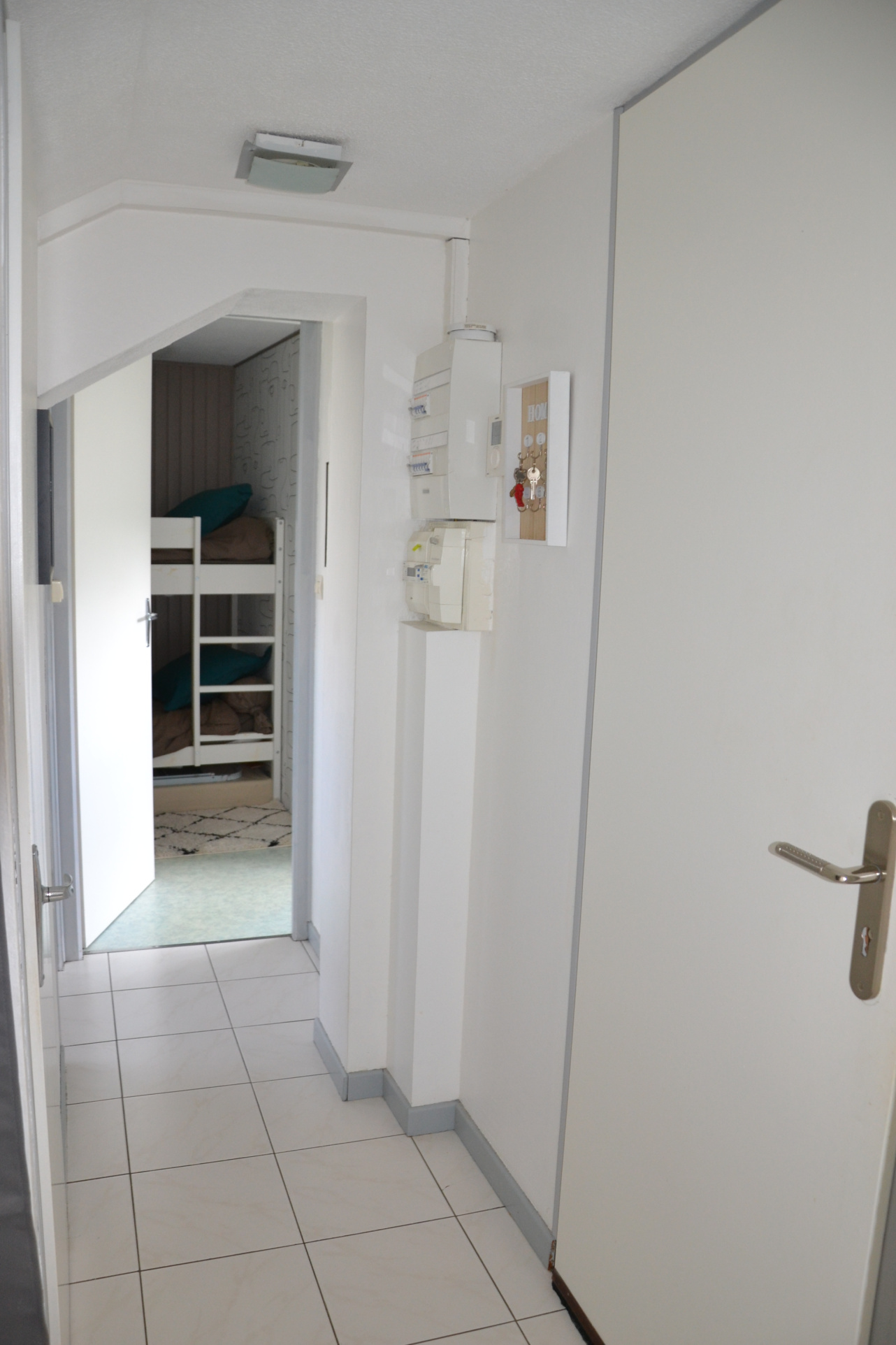 Ce lumineux T2 traversant Nord / Sud, vous offre une entrée avec débarras desservant un grand séjour avec cuisine ouverte tout équipée d'un côté, et une belle chambre avec lit double et lits superposés de l'autre.