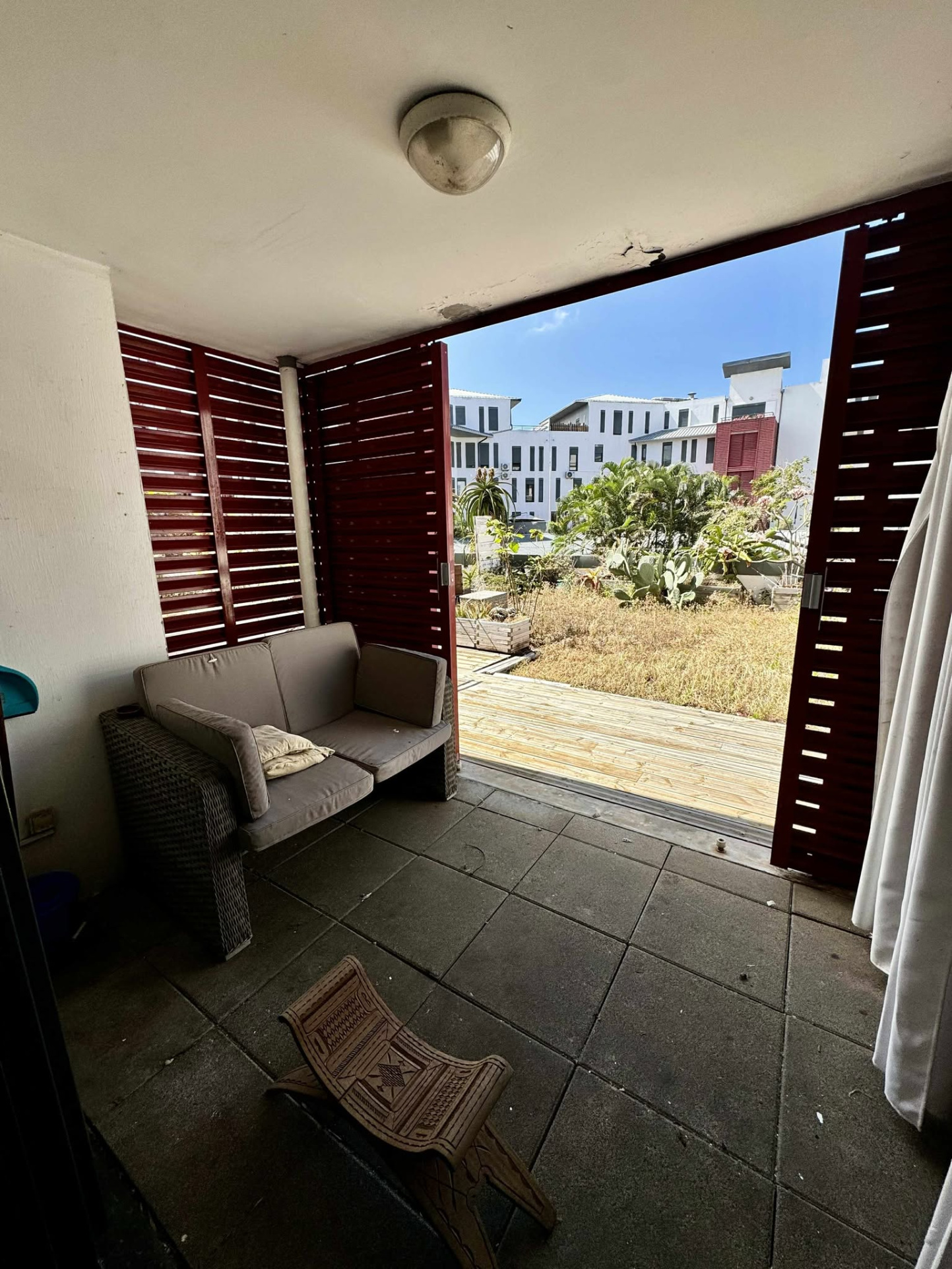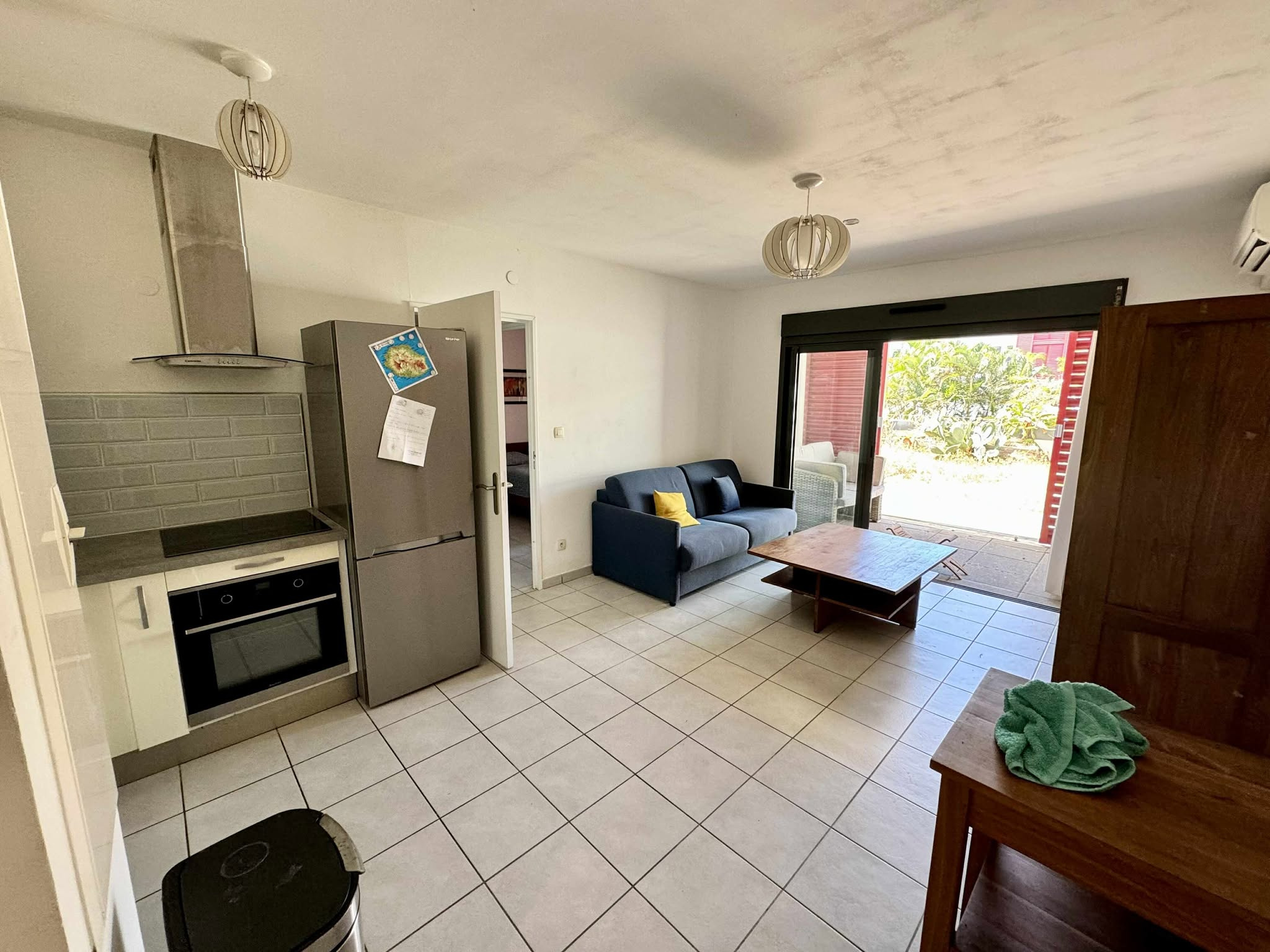Il se compose d'une entrée avec placard, un séjour climatisé, une cuisine aménagée et équipée (placards, plaque, hotte et four), un WC, une chambre avec placard et climatisation, une salle d'eau (douche et meuble sous une vasque), une varangue de 8.60 m2 et un jardin privatif de 56.10 m2.