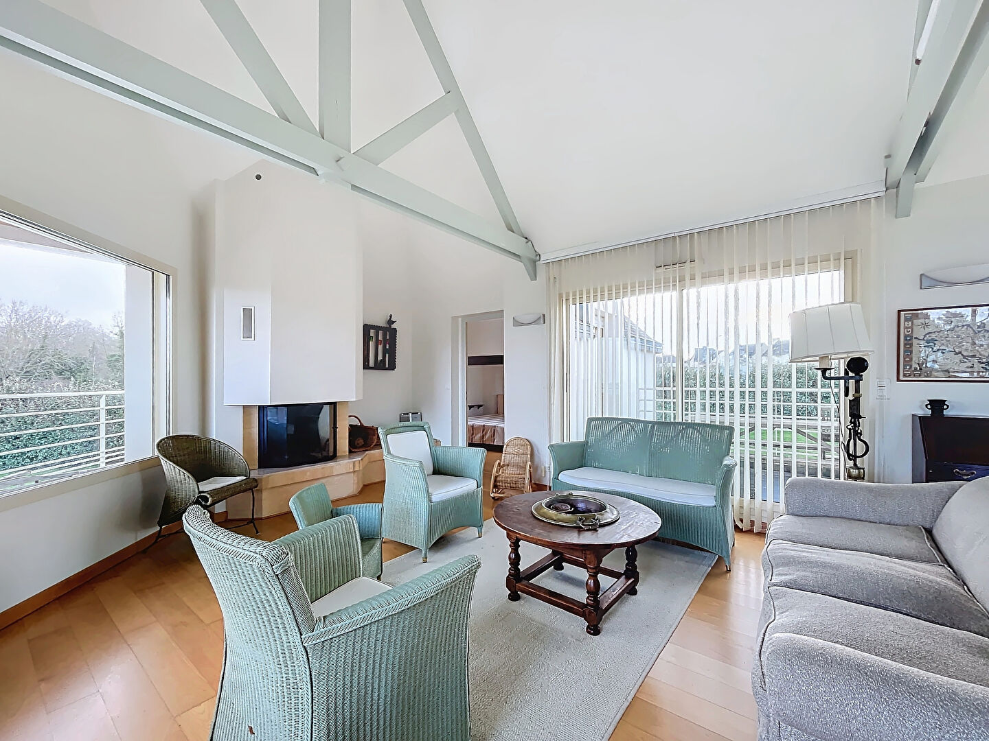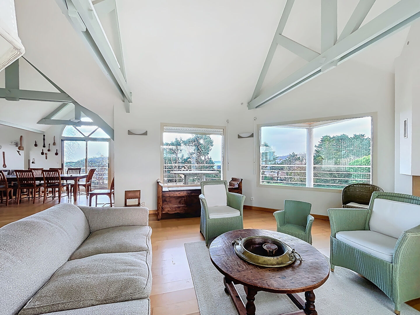 L'Agence MAISON ROUGE vous propose, dans un secteur prisé à proximité du golf et de la plage de Pen Guen, cette propriété contemporaine de 2001 édifiée sur une parcelle de plus de 4494 m². Son agencement atypique a été pensé pour que les pièces de vie soient ouvertes vers la mer.