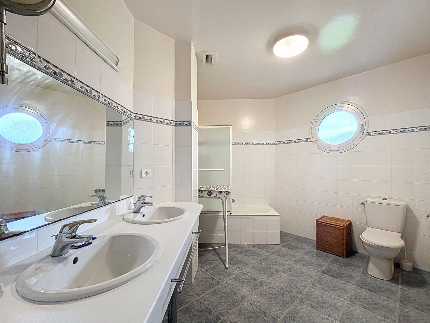 Hall d'entrée avec grands placards de rangement qui ouvre sur un couloir desservant les chambres. Une très grande chambre avec placards et accès vers le jardin assortis d'une grande salle de bain avec WC ; une chambre de belle taille avec placards, salle de douche et accès jardin ; une chambre de taille plus modeste avec placards et salle de douche. Un grand garage a été converti en chambre-dortoir avec accès jardin et petite vue mer, avec douche et petite cuisine. Le rez-de-chaussée est complété d'un WC dans le couloir principal, une petite pièce technique dans la chambre-dortoir et un local jardin accessible de l'extérieur.