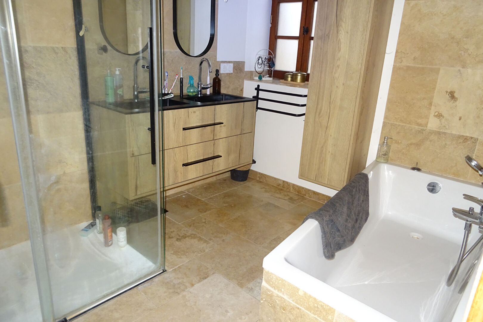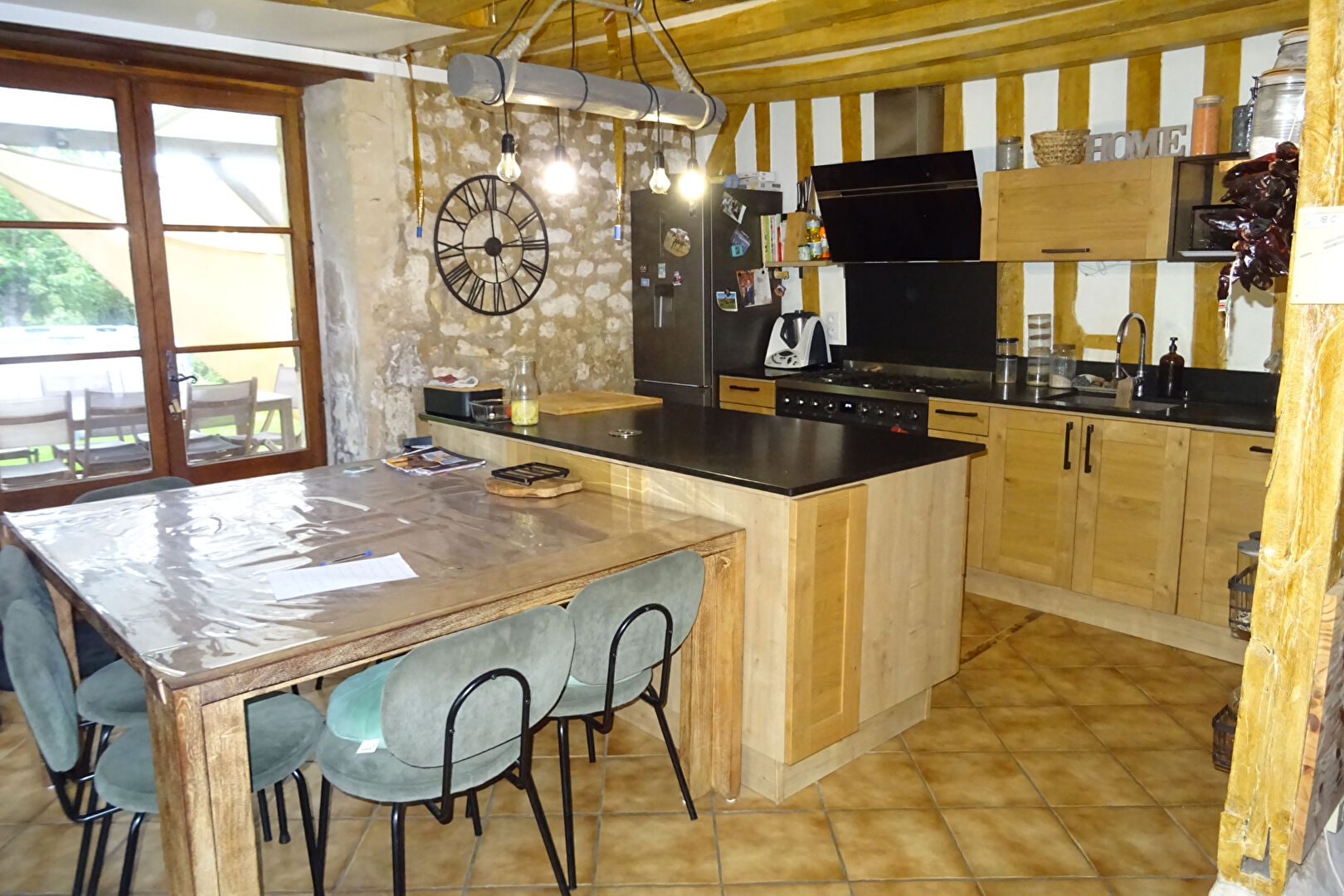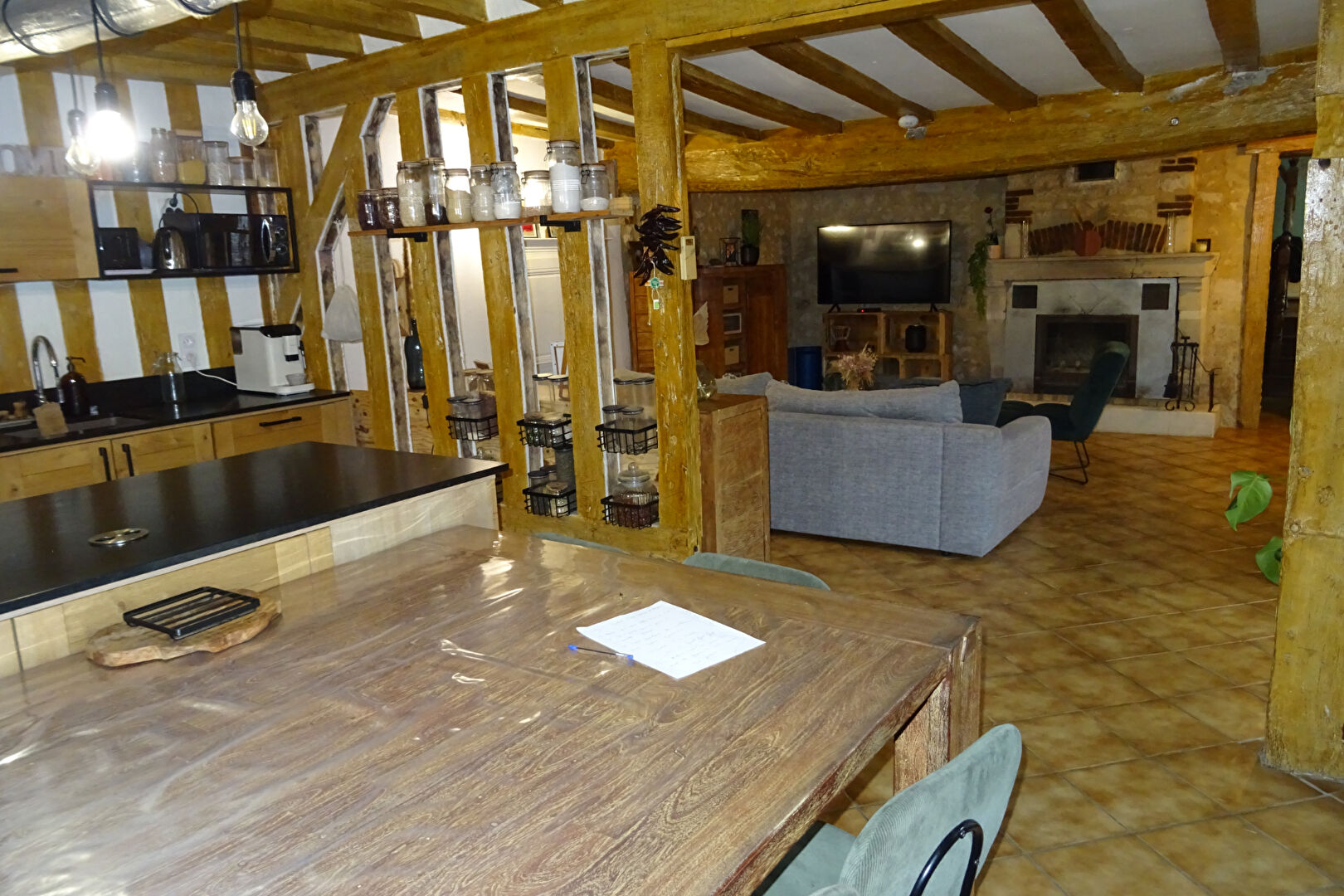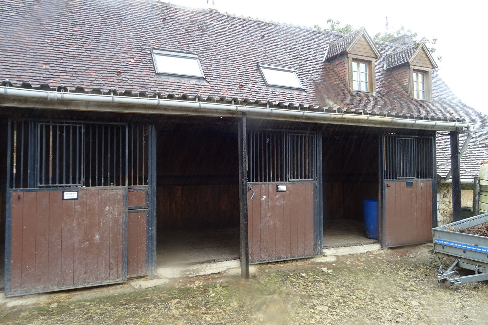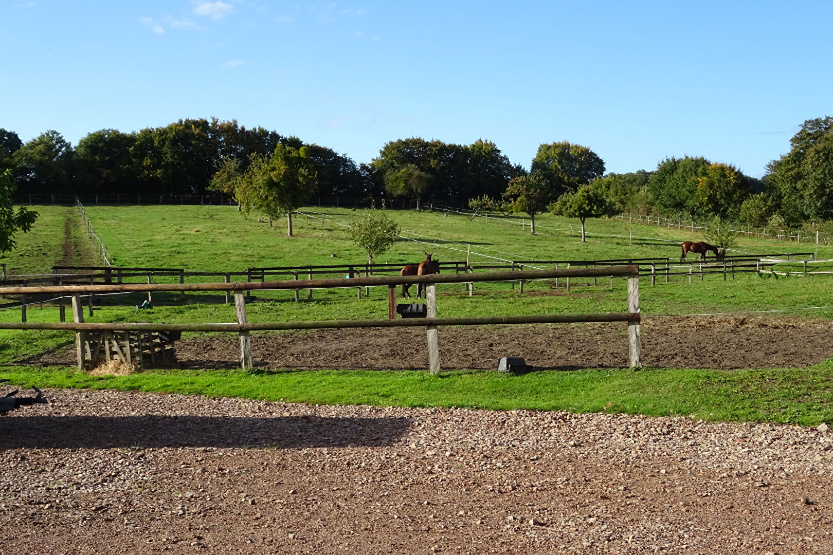Belle longère en pierres apparentes comprenant entrée, grande pièce regroupant : cuisine aménagée séjour-salon avec cheminée, sde neuve + baignoire, wc. A l'étage : 3 chambres. Garage avec grenier. 5 boxs à chevaux avec 1 salle de soins, 5 paddocks avec abreuvoir, carrière 50m x 30m. Terrasse avec vue sur une mare.