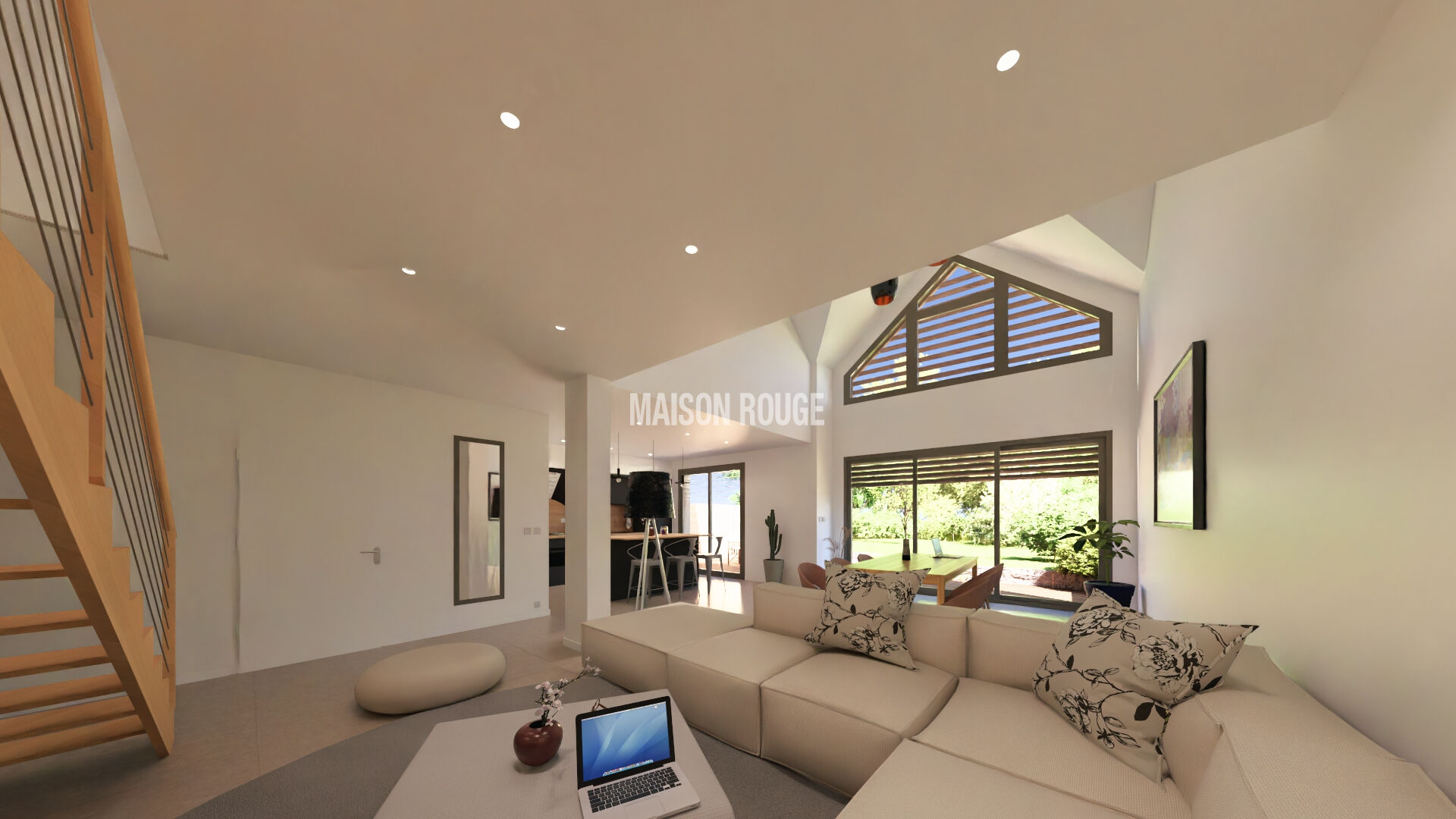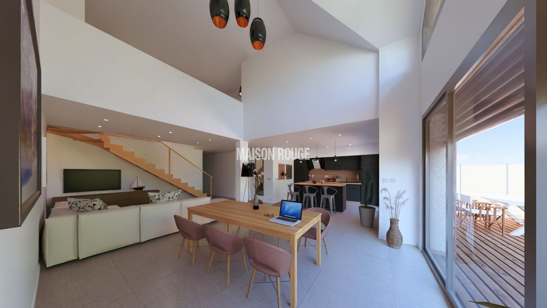 Au rez de chaussée, la maison bénéficie d'un grand séjour cathédrale plein Sud avec une cuisine livrée aménagée et équipée, le tout donnant sur un jardin clos au Sud. une chambre avec salle d'eau, WC