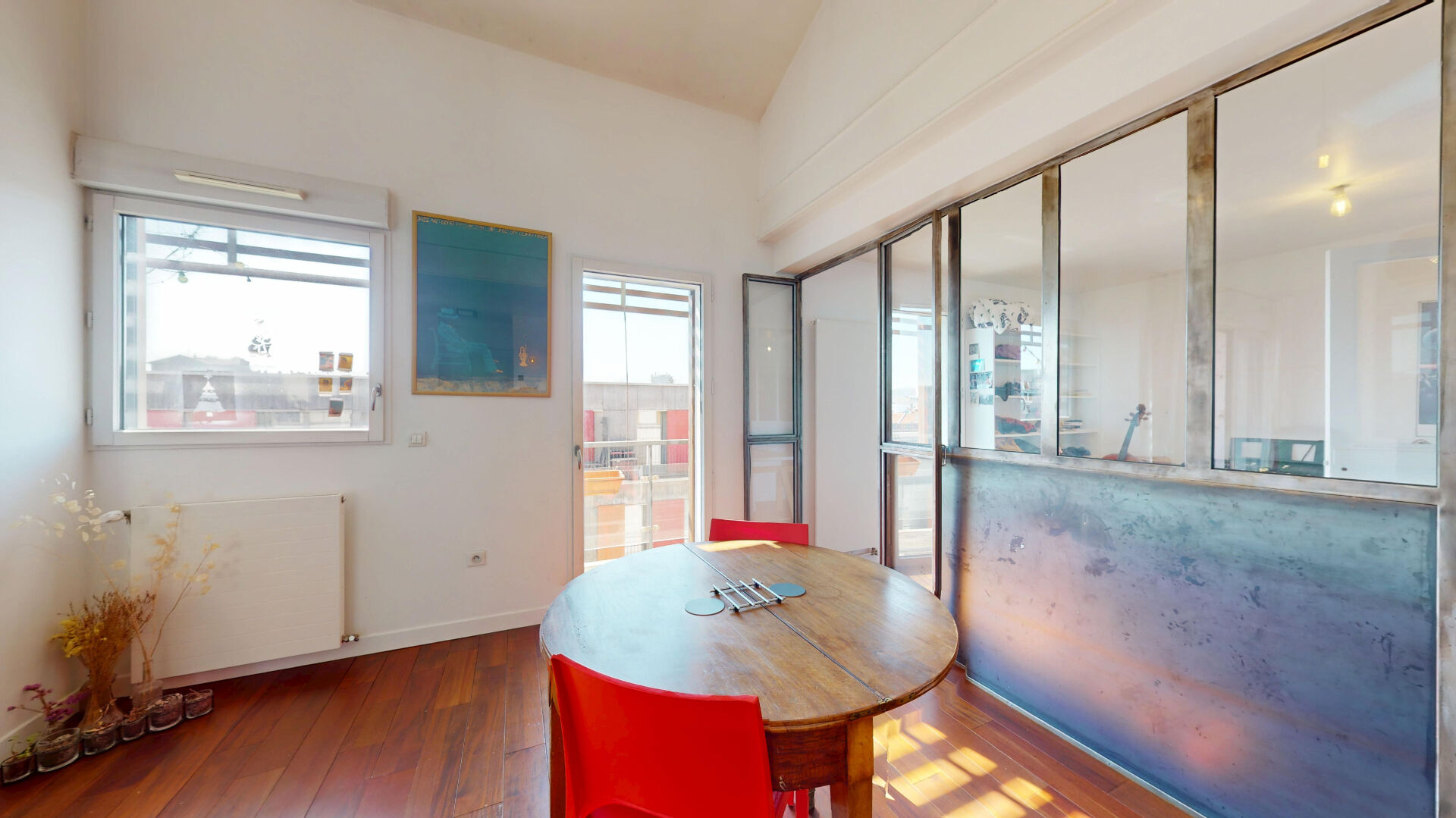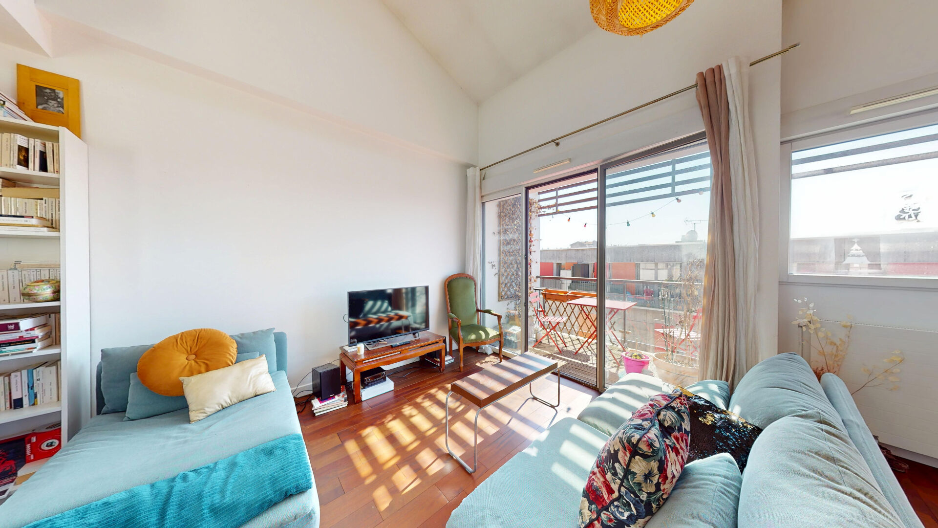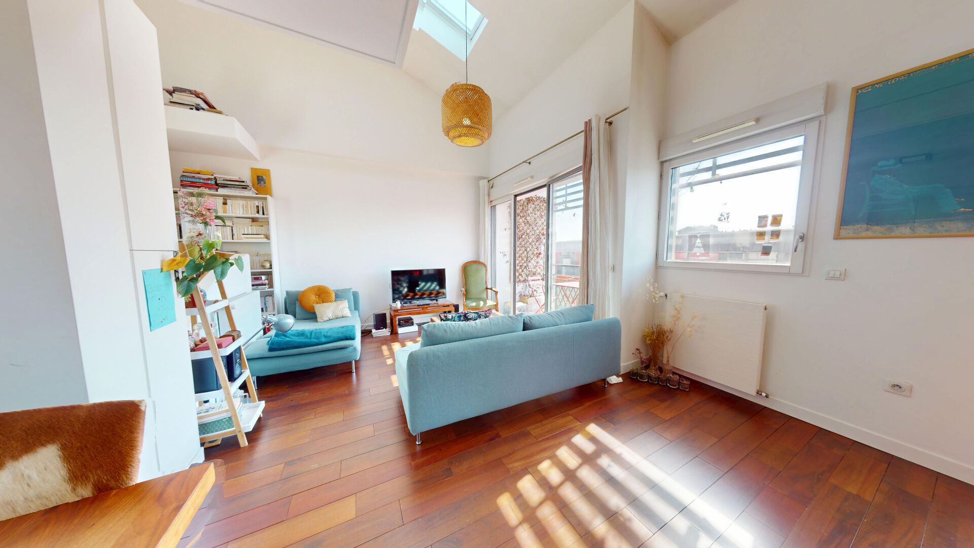 SALON CATHÉDRALE (32 m²) : attenant à la salle à manger et bénéficiant toujours d'une grande hauteur sous plafond. Cette pièce est littéralement baignée de lumière avec un vélux au dessus de l'important volume ainsi qu'une grande baie vitrée exposée plein sud, pour un ensoleillement tout au long de la journée donnant sur un balcon plus large permettant de loger une petite table pour manger dehors.
