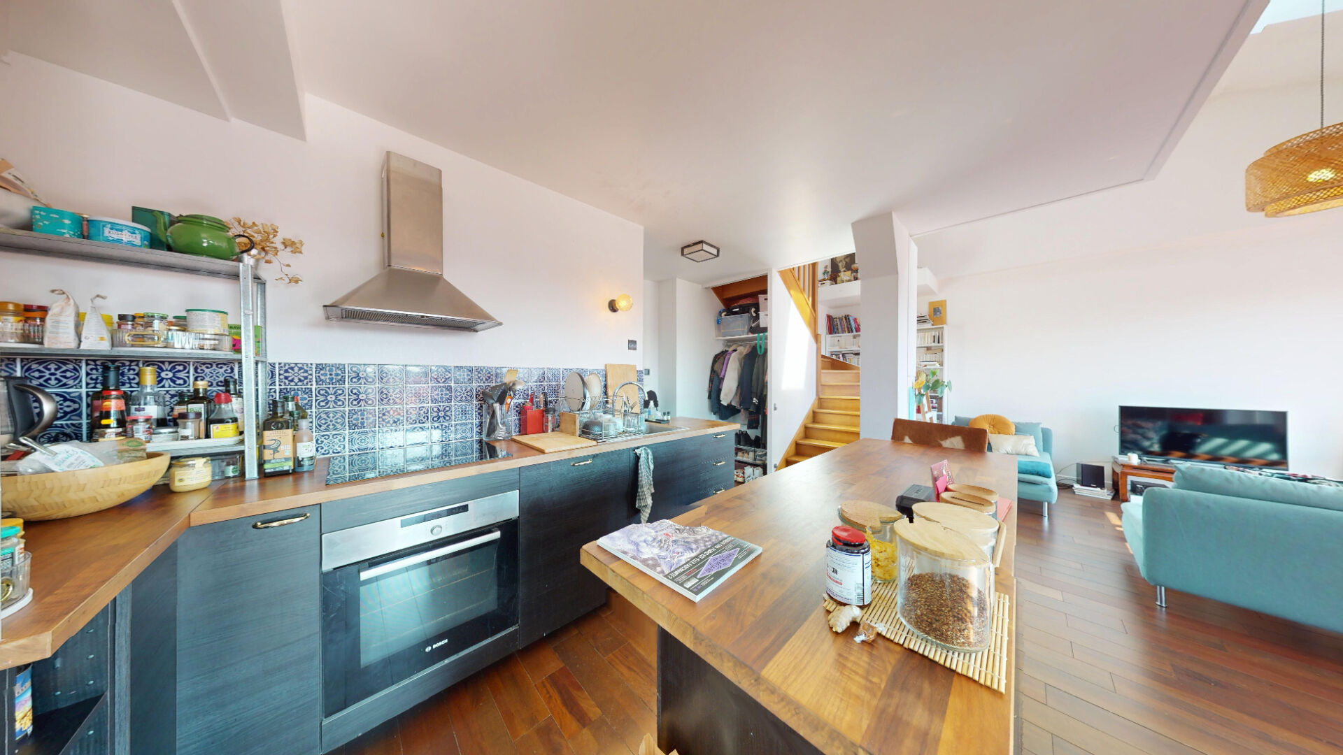 Un escalier design, devant une bibliothèque, mène au 4ème et dernier étage.