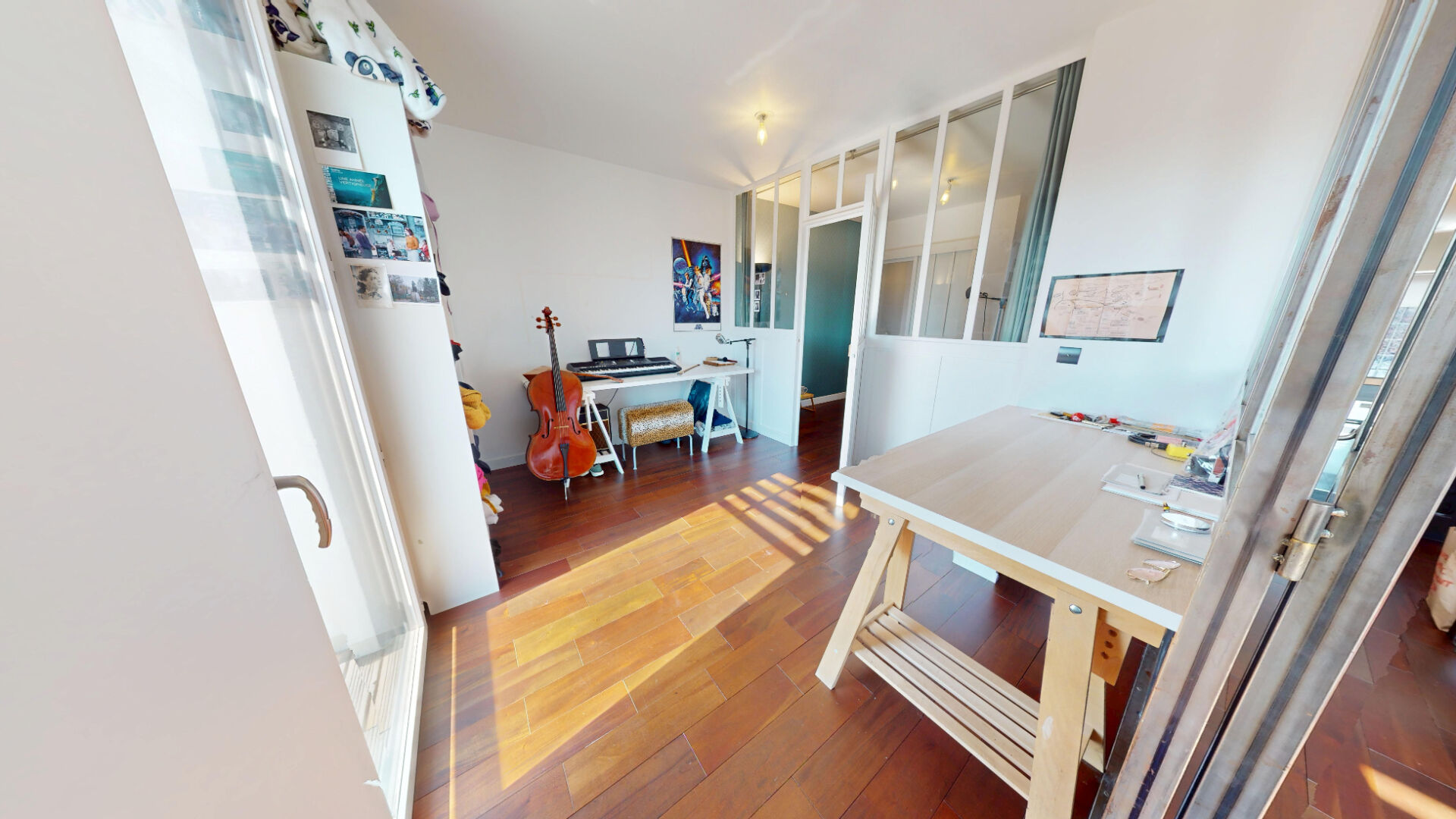 BUREAU : séparé de la salle à manger par une verrière en fer forgé. Actuellement aménagé en studio de musique, avec une porte-fenêtre ouvrant également sur le balcon filant exposé plein SUD.