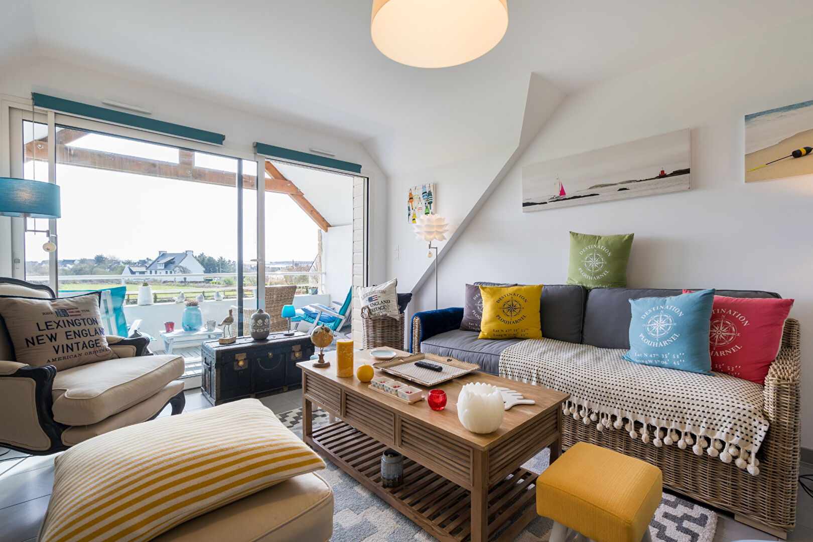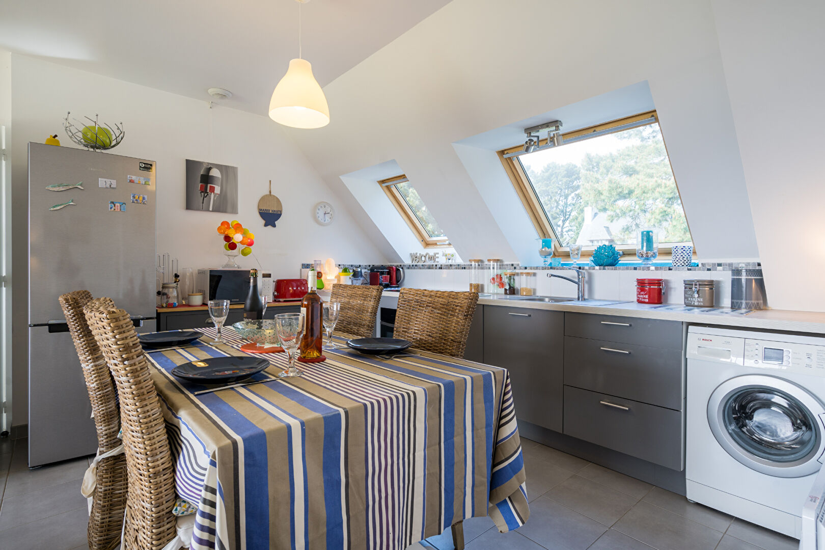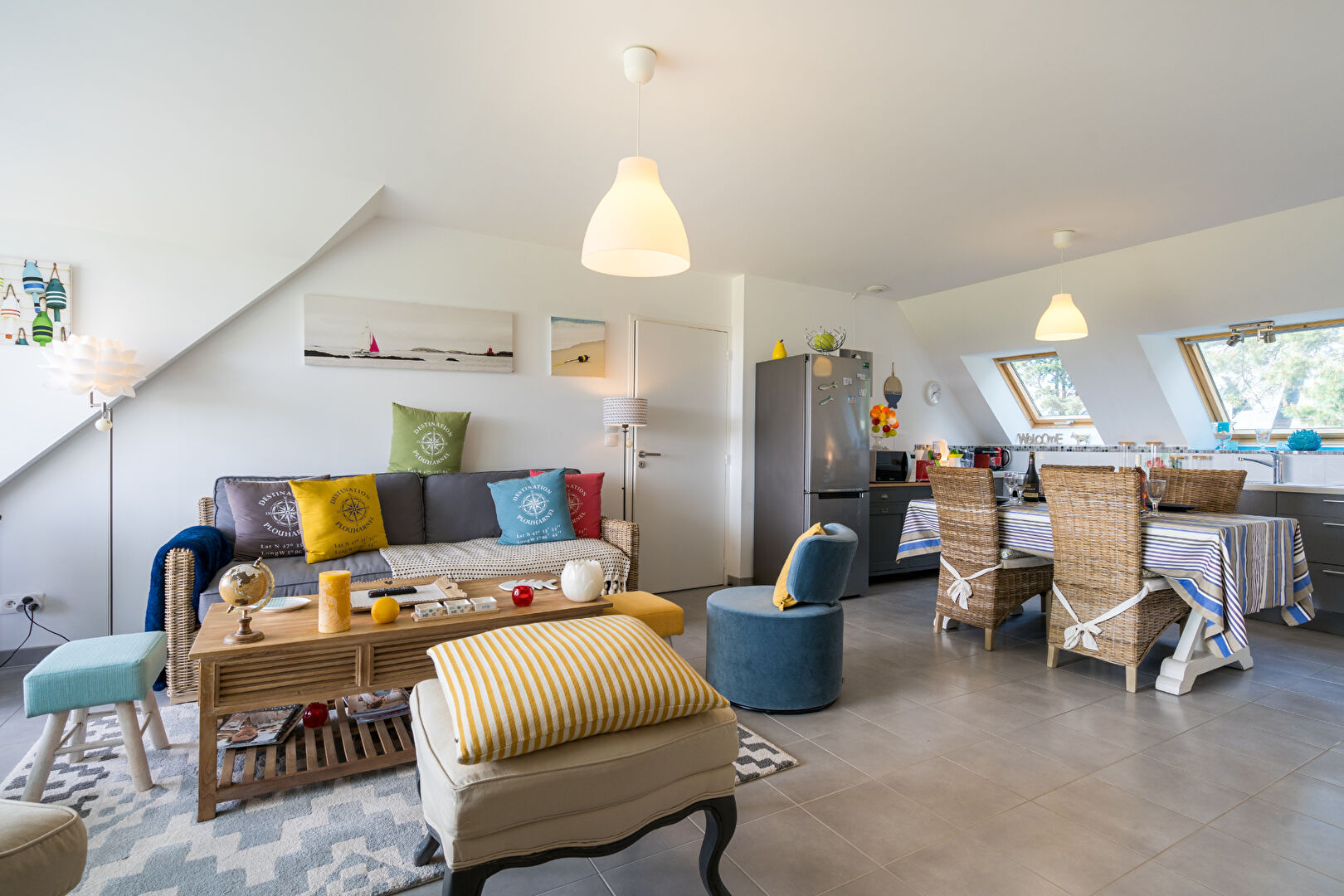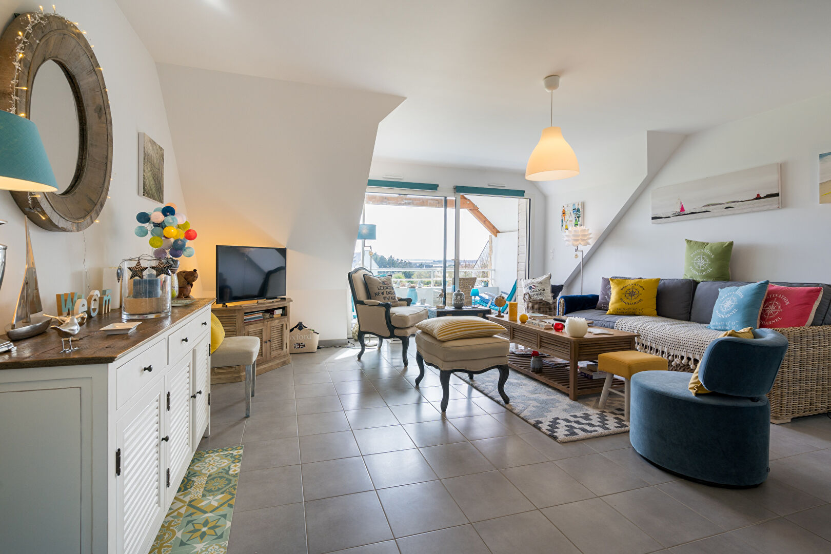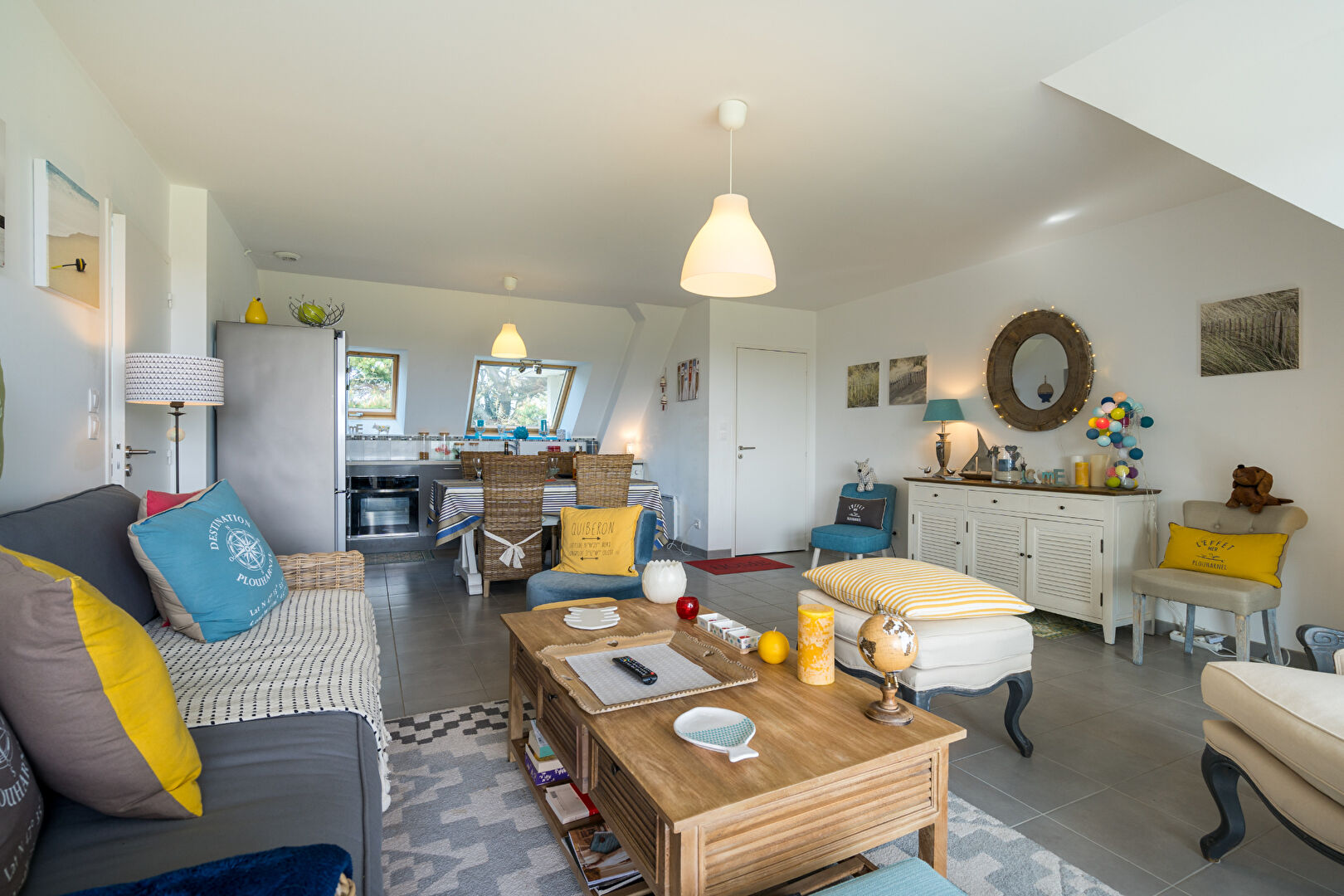 En exclusivité, A proximité des services et commodités du bourg, dans un environnement mer et lande, agréable appartement en excellent état offrant : entrée, séjour salon cuisine ouverte A/E donnant sur grande loggia, espace nuit composé de 2 chambres et SDB.
