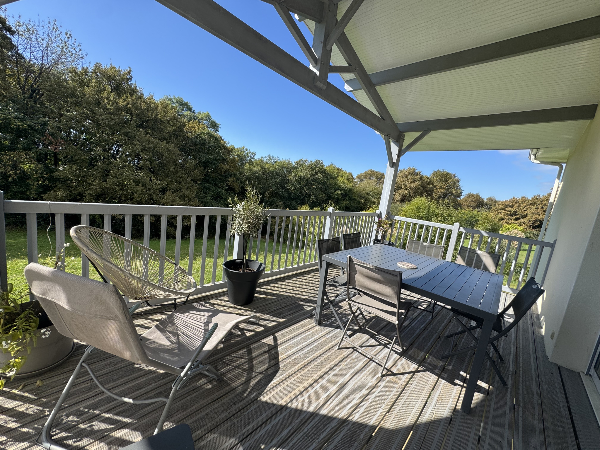 La maison dispose également d'une cave en sous-sol, pratique pour le rangement ou le stockage, et d'une agréable terrasse sur pilotis offrant une vue dégagée sur la nature environnante, idéale pour profiter des beaux jours.