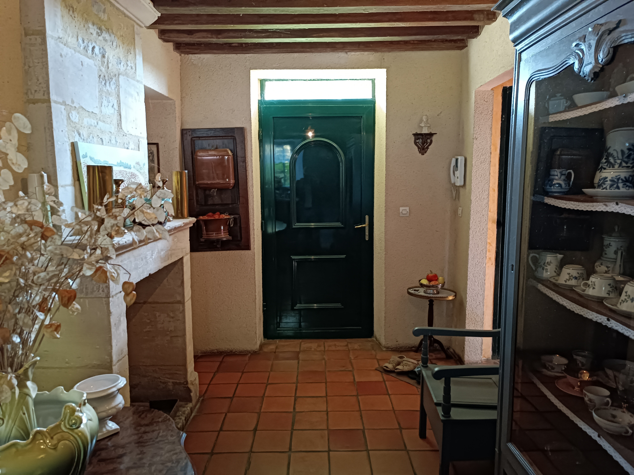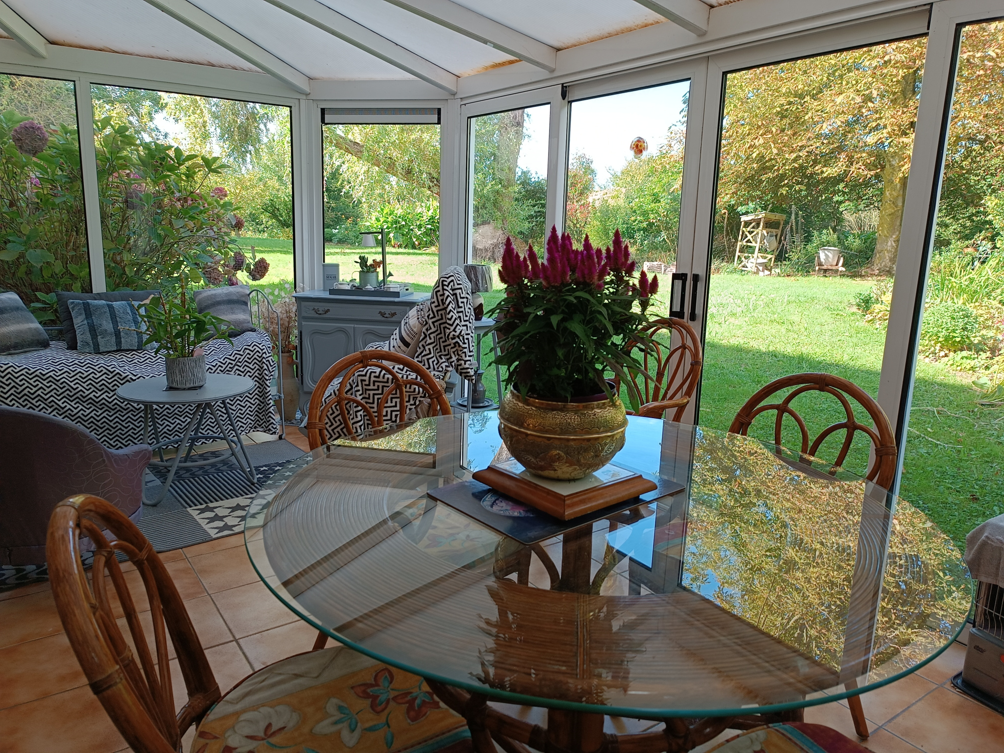 La maison comprend une belle entrée avec cheminée, une grande cuisine aménagée et équipée de 18 m2, un séjour avec cheminée de 23 m2 ouvrant sur véranda de 18 m2 avec une jolie vue sur le jardin. Toujours, au rez- de-chaussée, nous avons également un très beau salon avec de nombreux élements authentiques : de la tomette d'origine, une cheminée en pierre, des poutres et solives....