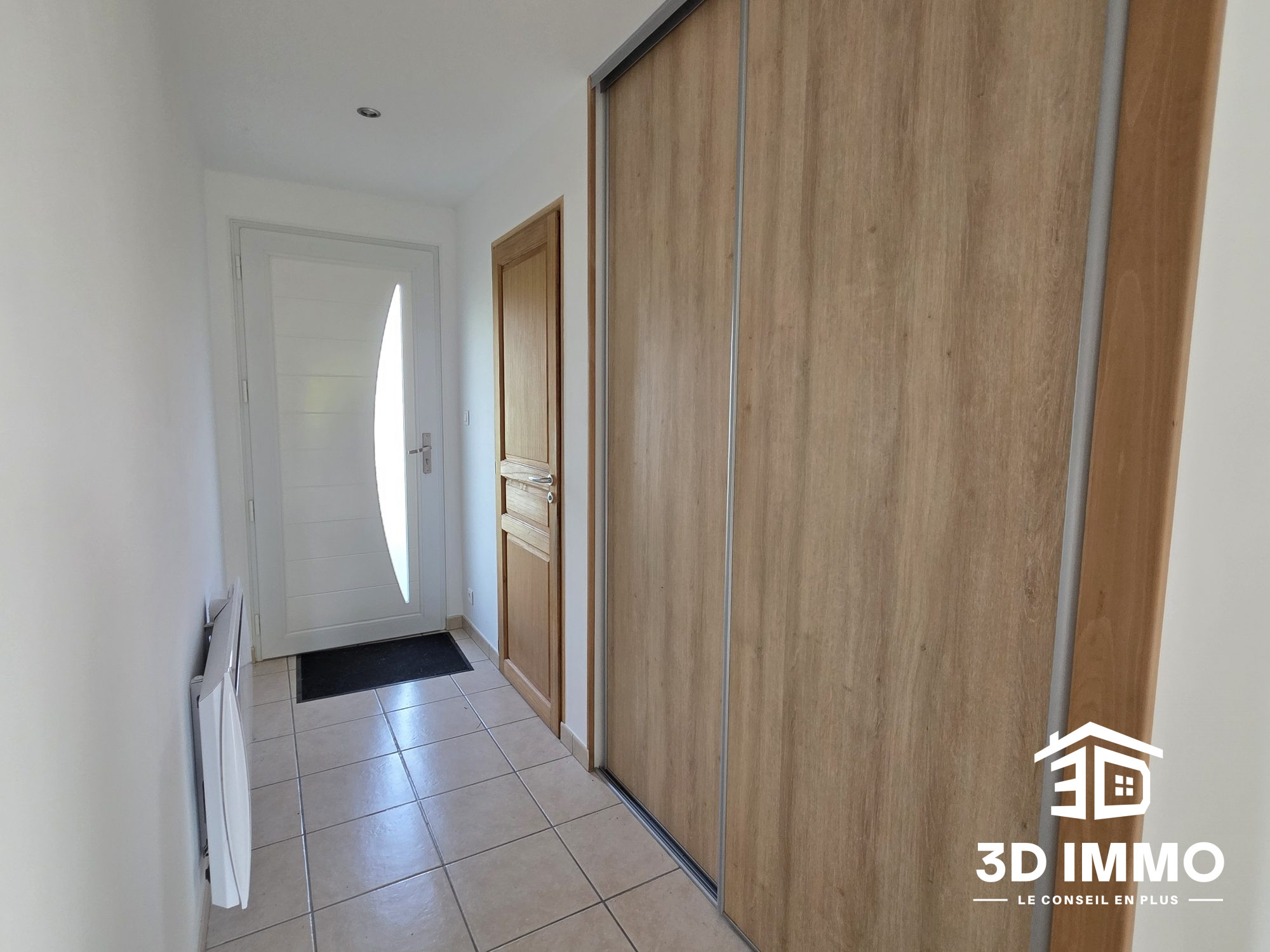 Entrée avec placard, WC, séjour avec cuisine ouverte, salle de bains avec baignoire et douche, deux chambres, buanderie.