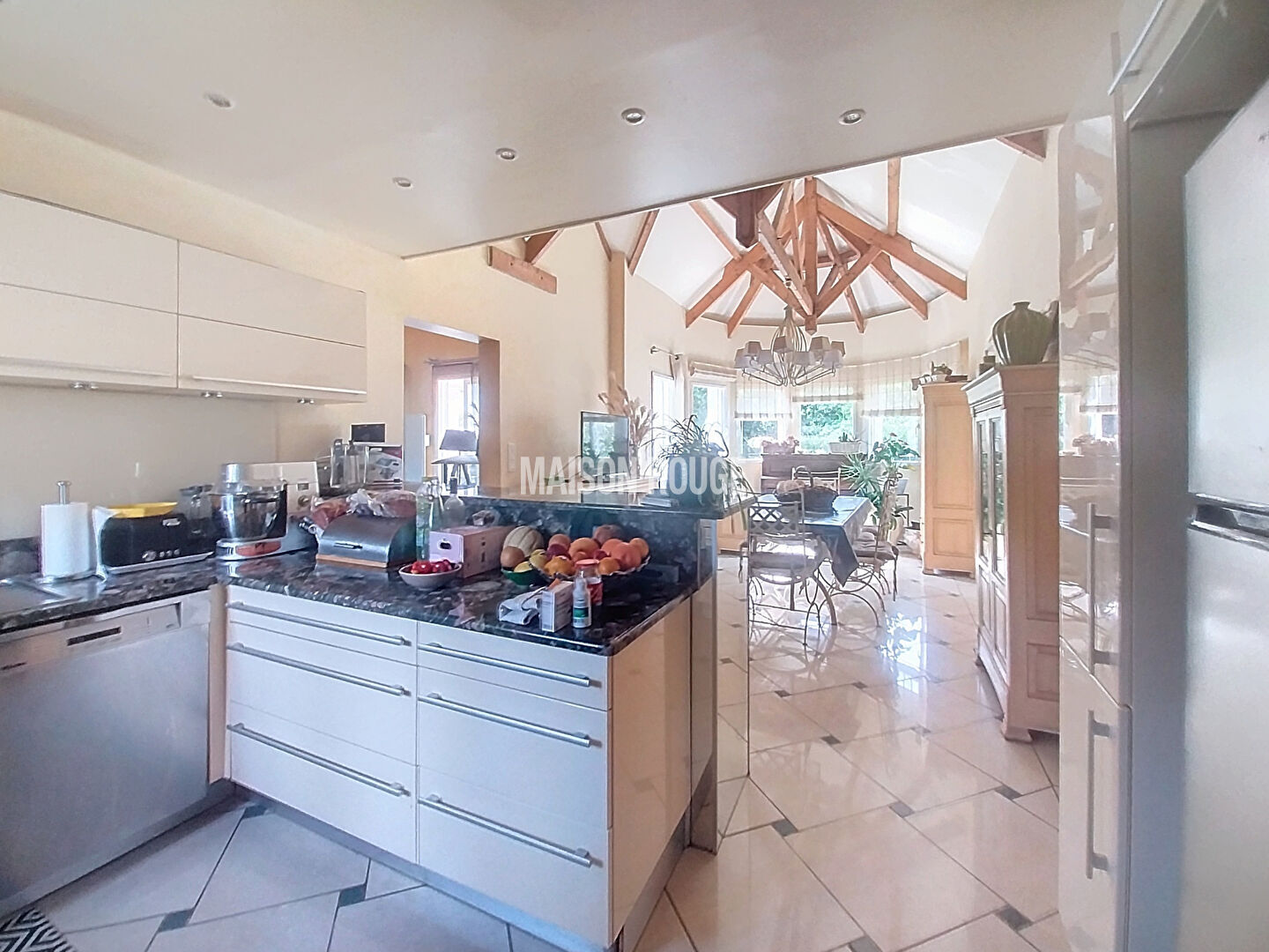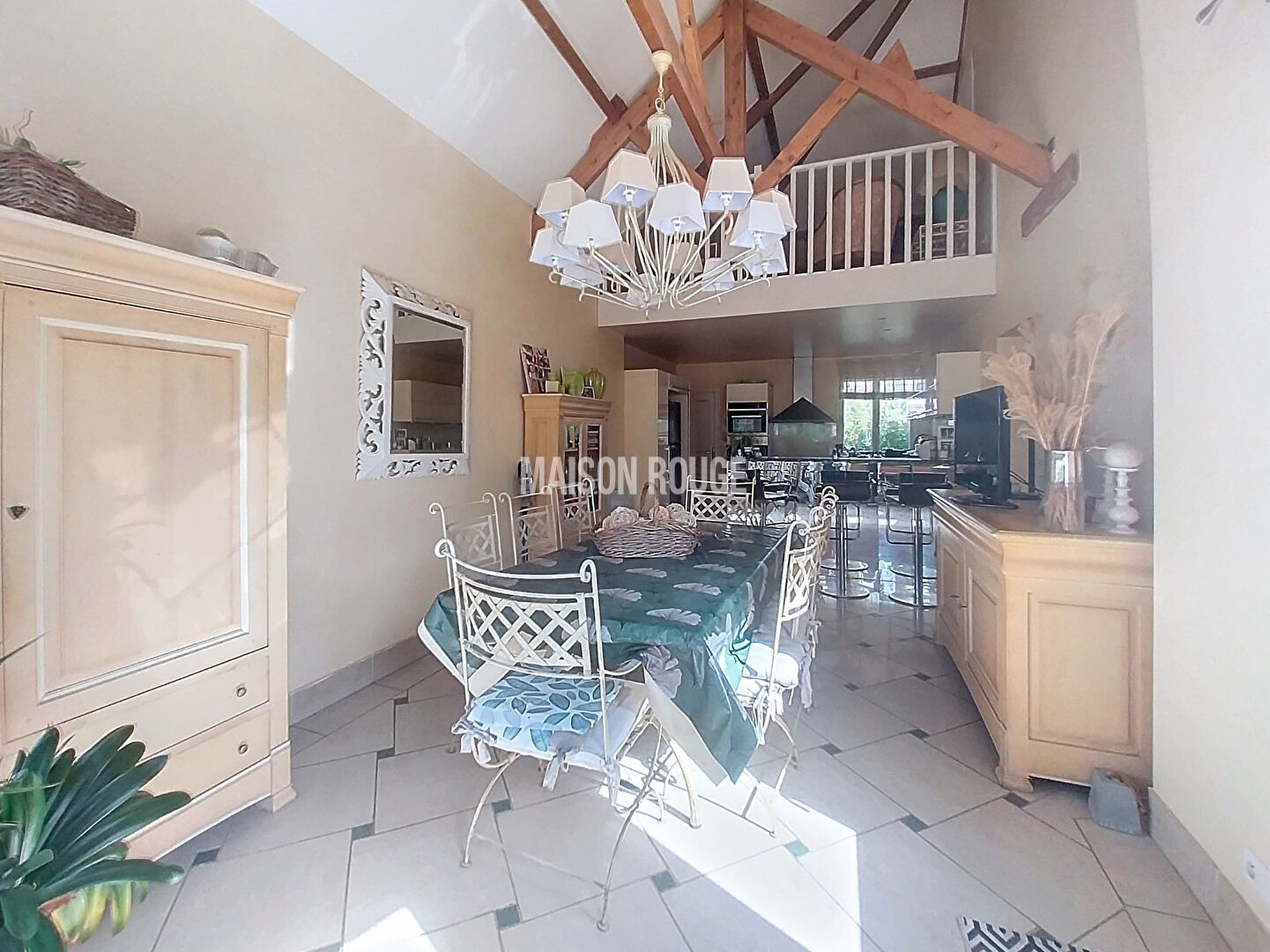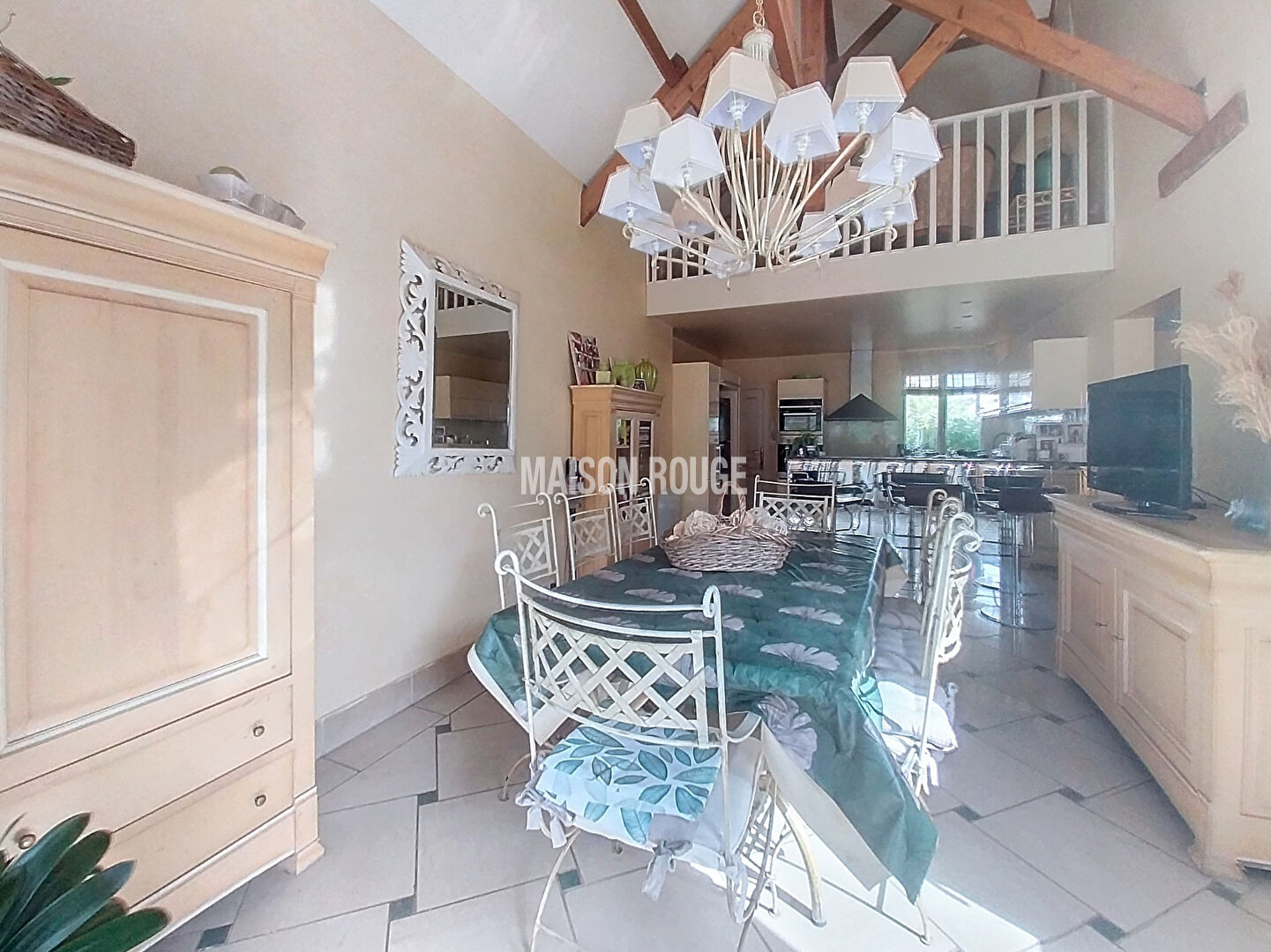 Au rez de chaussée, un salon avec cheminée, cuisine ouverte avec un toit cathédrale, deux chambres dont une avec dressing, salle de bains avec douche, toilettes, cellier, garage, cave.