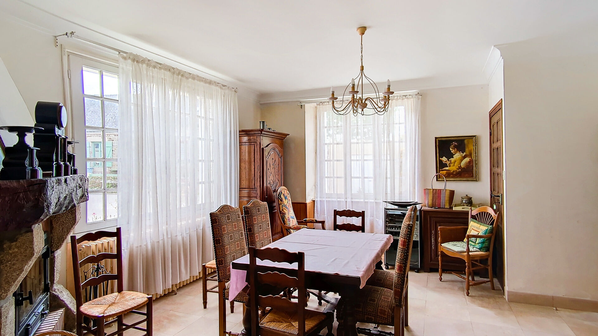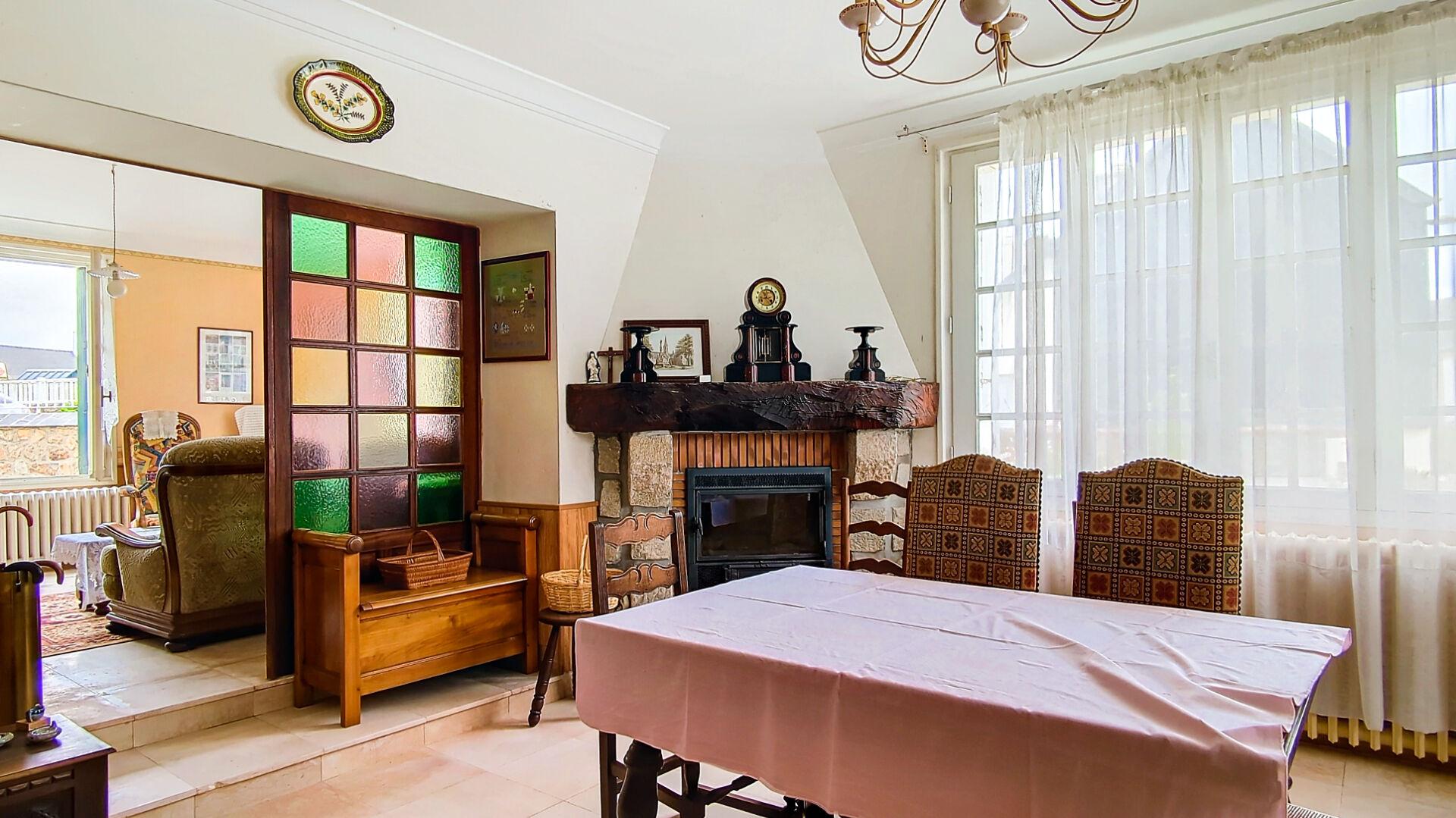 Une spacieuse salle à manger agrémentée d'une chaleureuse cheminée avec insert.
