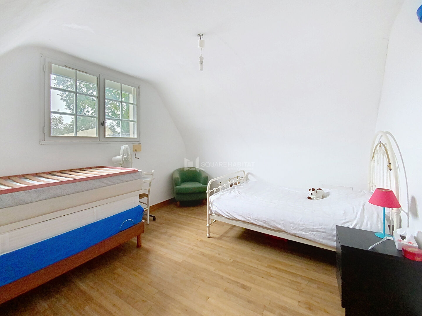 A l'étage, le dégagement mezzanine donne accès à trois chambres (dont une grande avec placard), un bureau et une salle de bains avec WC séparés.